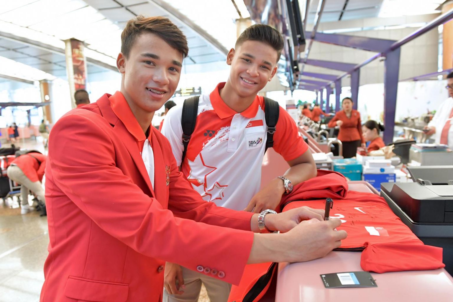 Ikhsan and Irfan Fandi (right), sons of Singapore football legend Fandi Ahmad, autographing a jersey at Changi Airport before departing for the SEA Games on Aug 12, 2017.