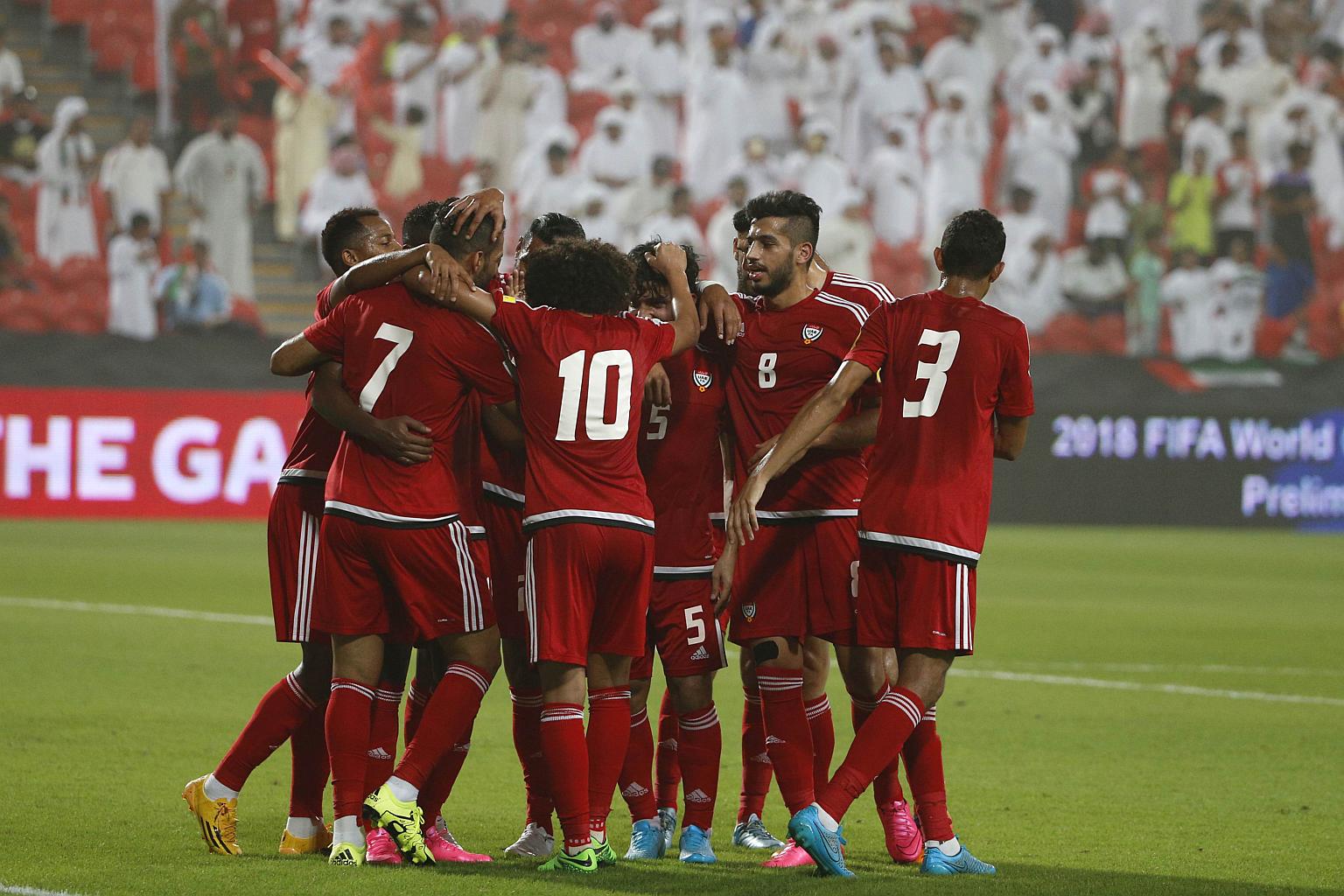 UAE's players celebrate after scoring a goal against Malaysia's team during their AFC qualifying football match for the 2018 FIFA World Cup at the Mohammed Bin Zayed Stadium in Abu Dhabi on Sept 3, 2015.