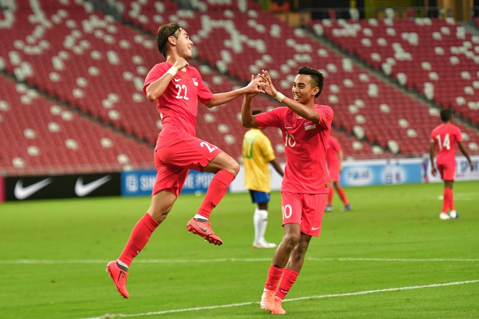 In a picture taken on June 8, 2019, Singapore’s Gabriel Quak celebrates a goal with Faris Ramli against Solomon Islands in an international friendly at the National Stadium in Singapore.