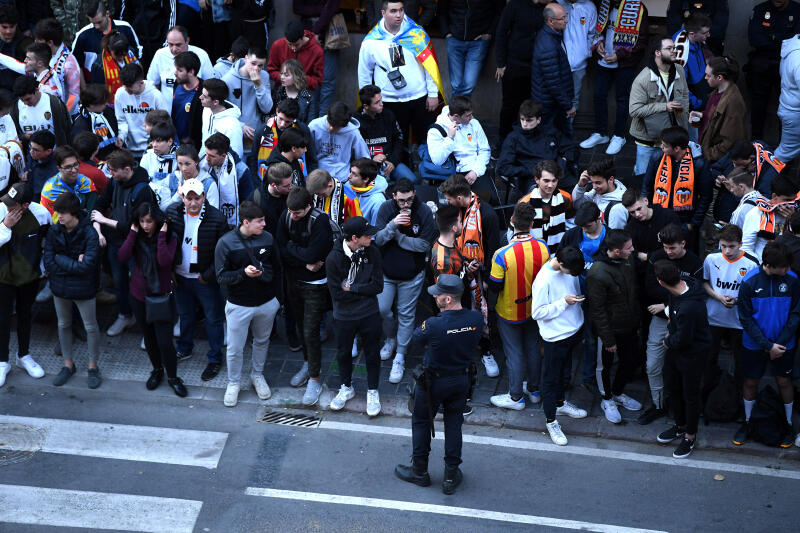 In a photo taken on March 10, 2020, fans gather outside Mestalla stadium in Valencia, Spain, before a match was played behind closed doors.