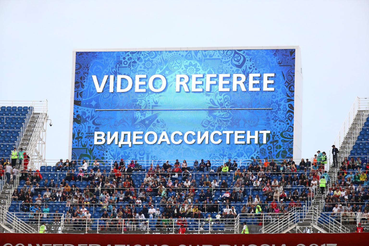 A view of the big screen at Fisht Stadium, Sochi, Russia, while video referee assistance is being used, during the Confederations Cup match between Australia and Germany on June 19, 2017.