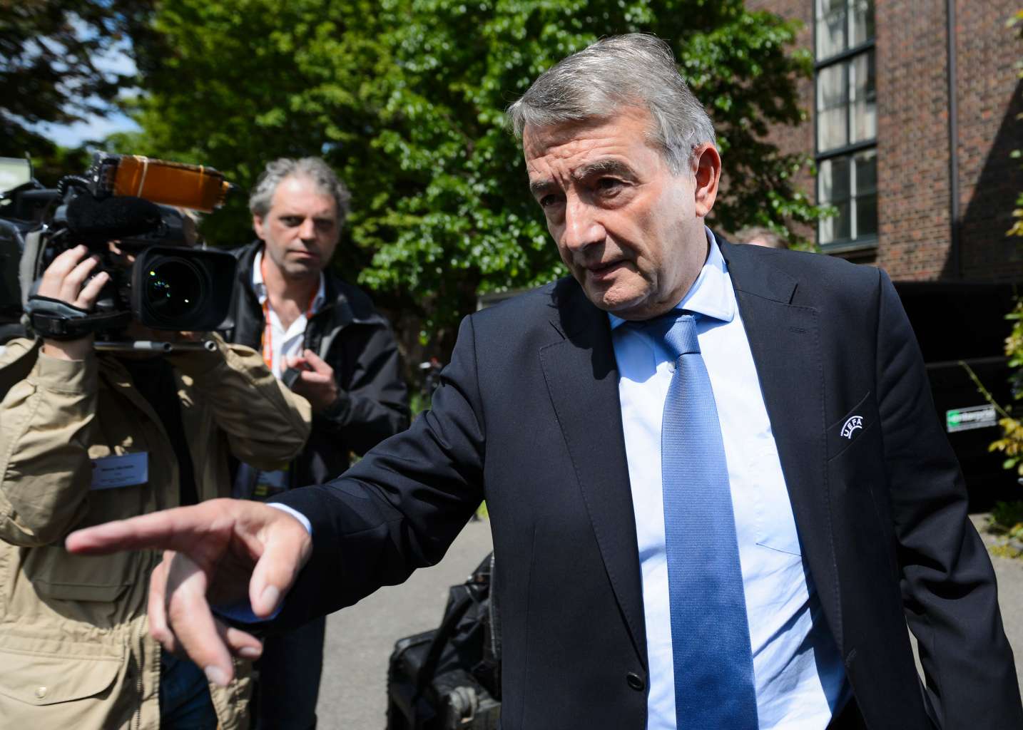 Former president of the German Football Association Wolfgang Niersbach gestures after leaving a meeting in Basel, on May 18, 2016.