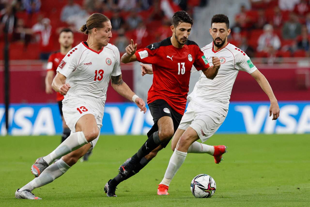 Players from Egypt (red) and Lebanon tussle for the ball during an Arab Cup football match in Doha on Dec 1, 2021.