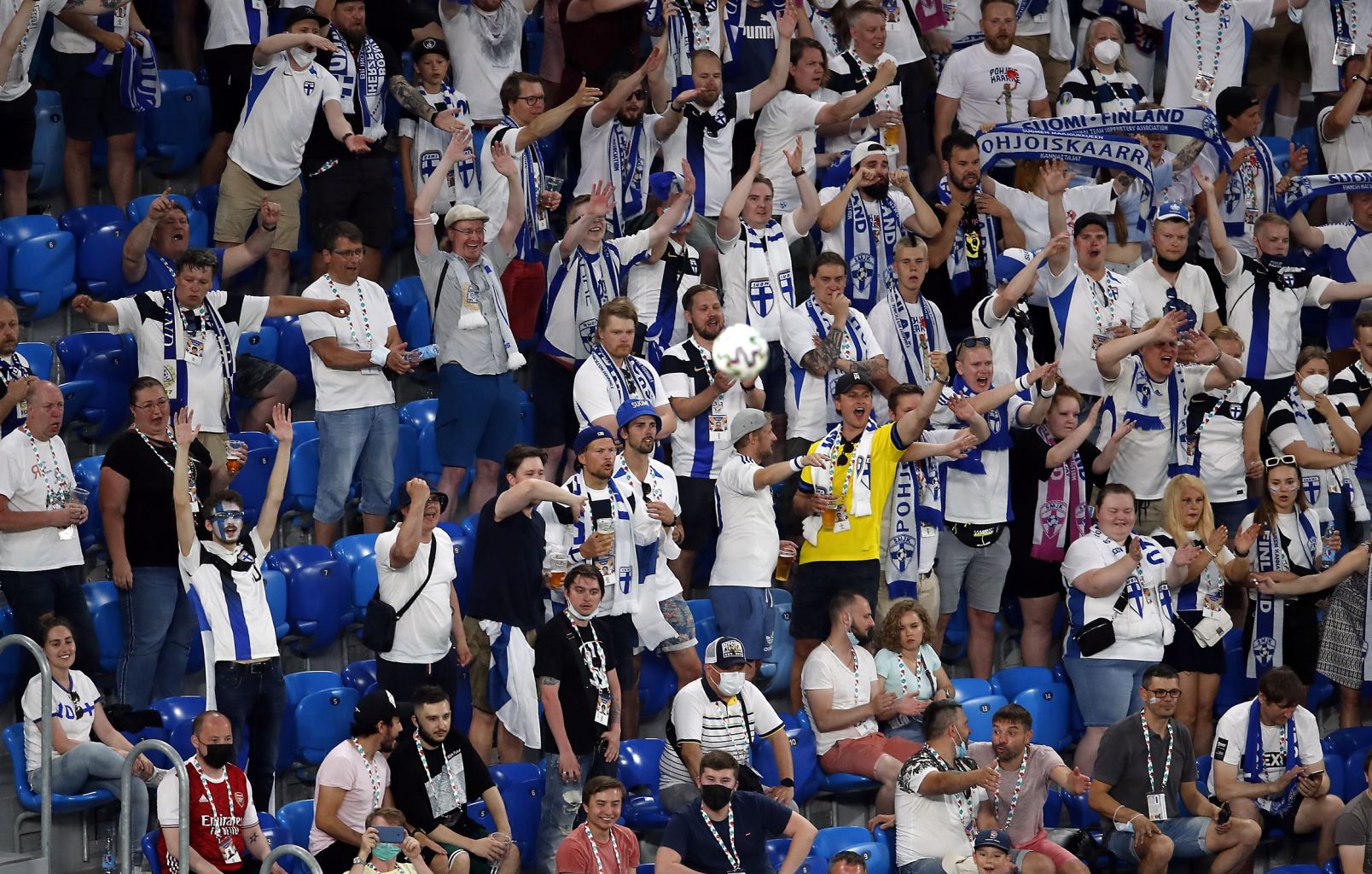 Finland fans cheer for their team during the match against Belgium in StPetersburg, on June 21, 2021.