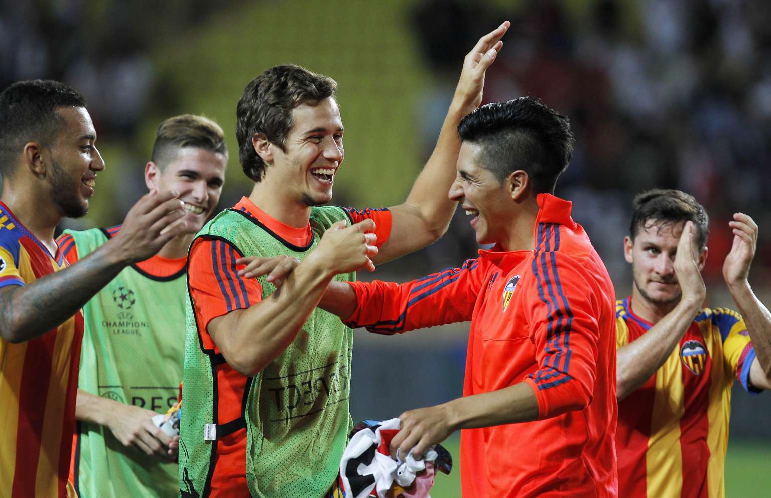 Valencia's players celebrate after winning the UEFA Champions League playoff football match between AS Monaco FC vs Valencia CF in Monaco on Tuesday,