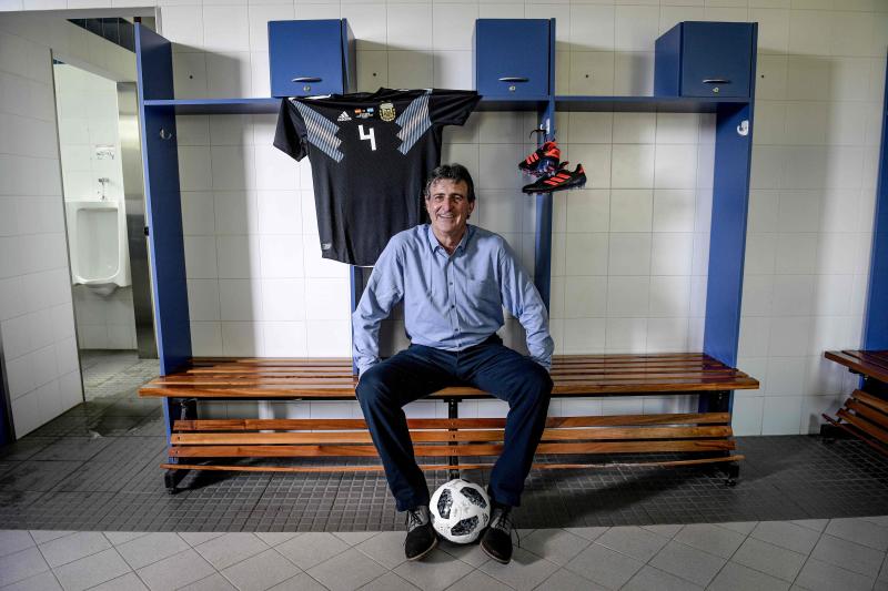 Argentina's former football star player Mario Kempes poses in a locker room in Ezeiza, Argentina, on March 29, 2018.