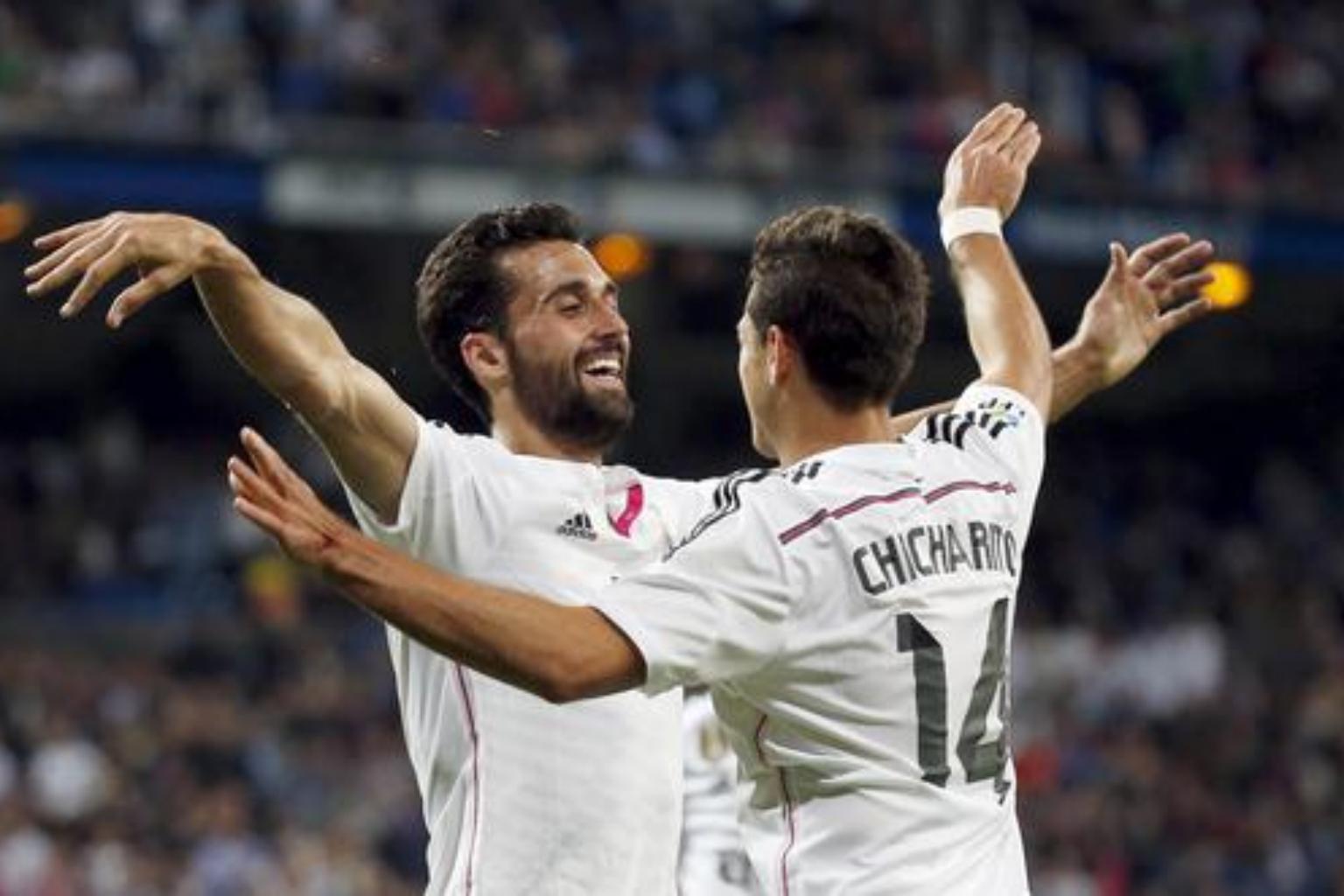 Alvaro Arbeloa (left) celebrating with team mate Javier "Chicharito" Hernandez after scoring a goal against Almeria during their Spanish first division soccer match at Santiago Bernabeu stadium in Madrid, Spain on April 29, 2015.