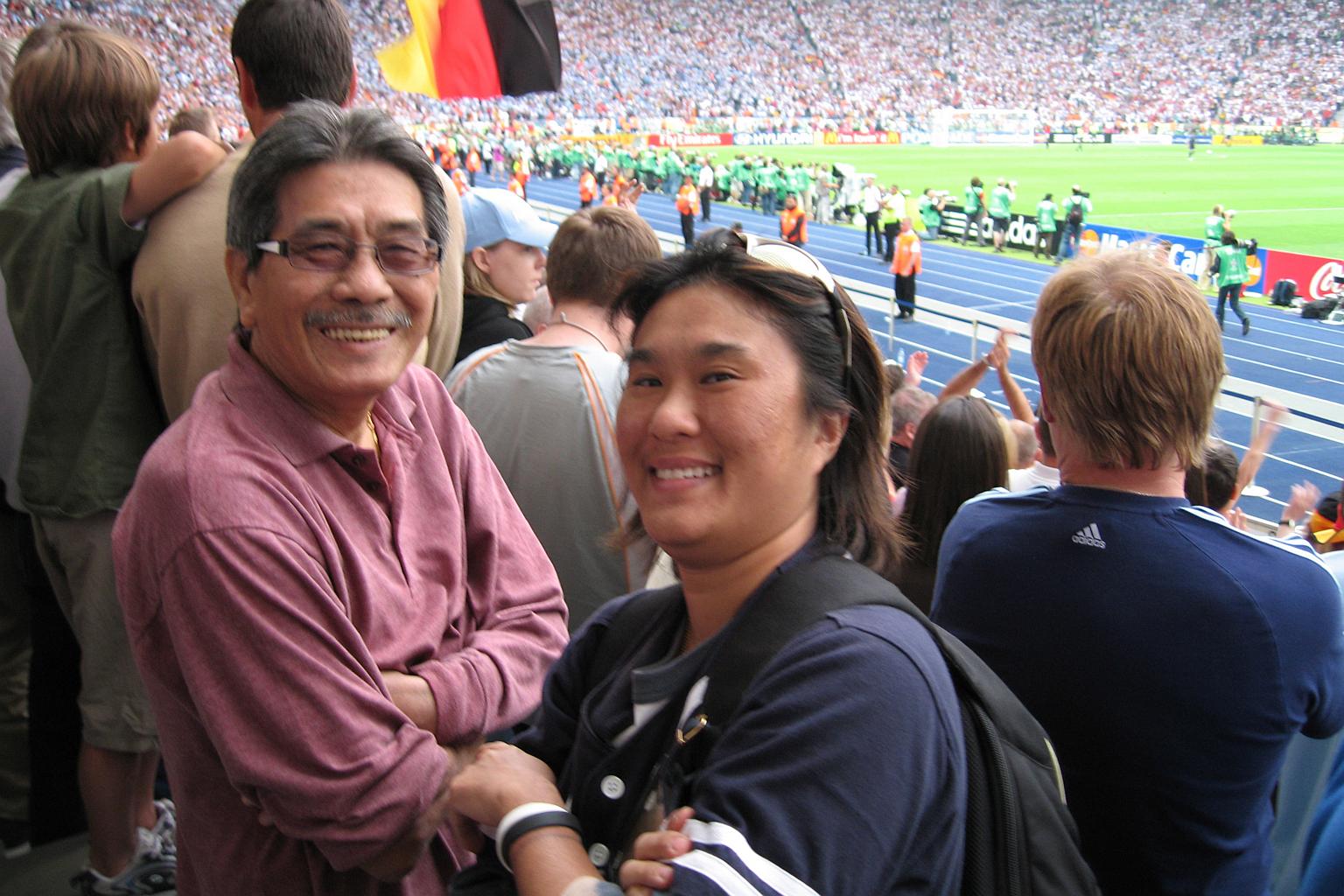 Former Singapore star Quah Kim Swee and daughter Bee Jin at the Germany-Argentina quarter-final in Berlin.