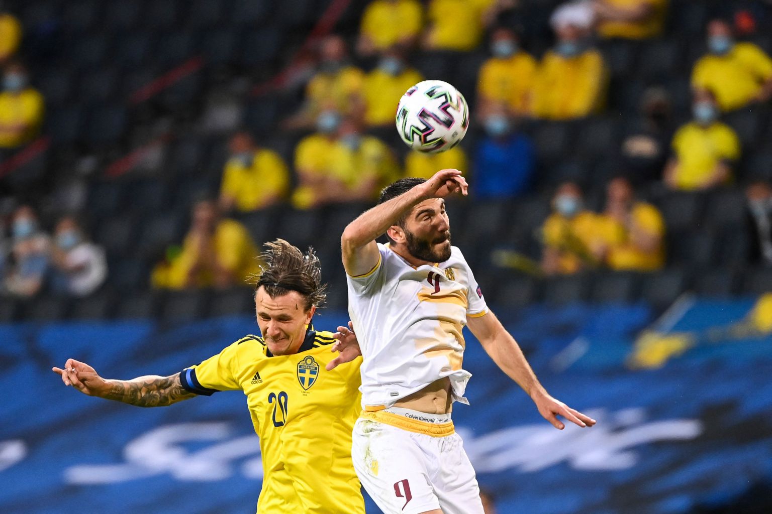 Sweden's Kristoffer Olsson (left) and Armenia's Artur Miranyan vie for the ball during a friendly football match on June 5, 2021.