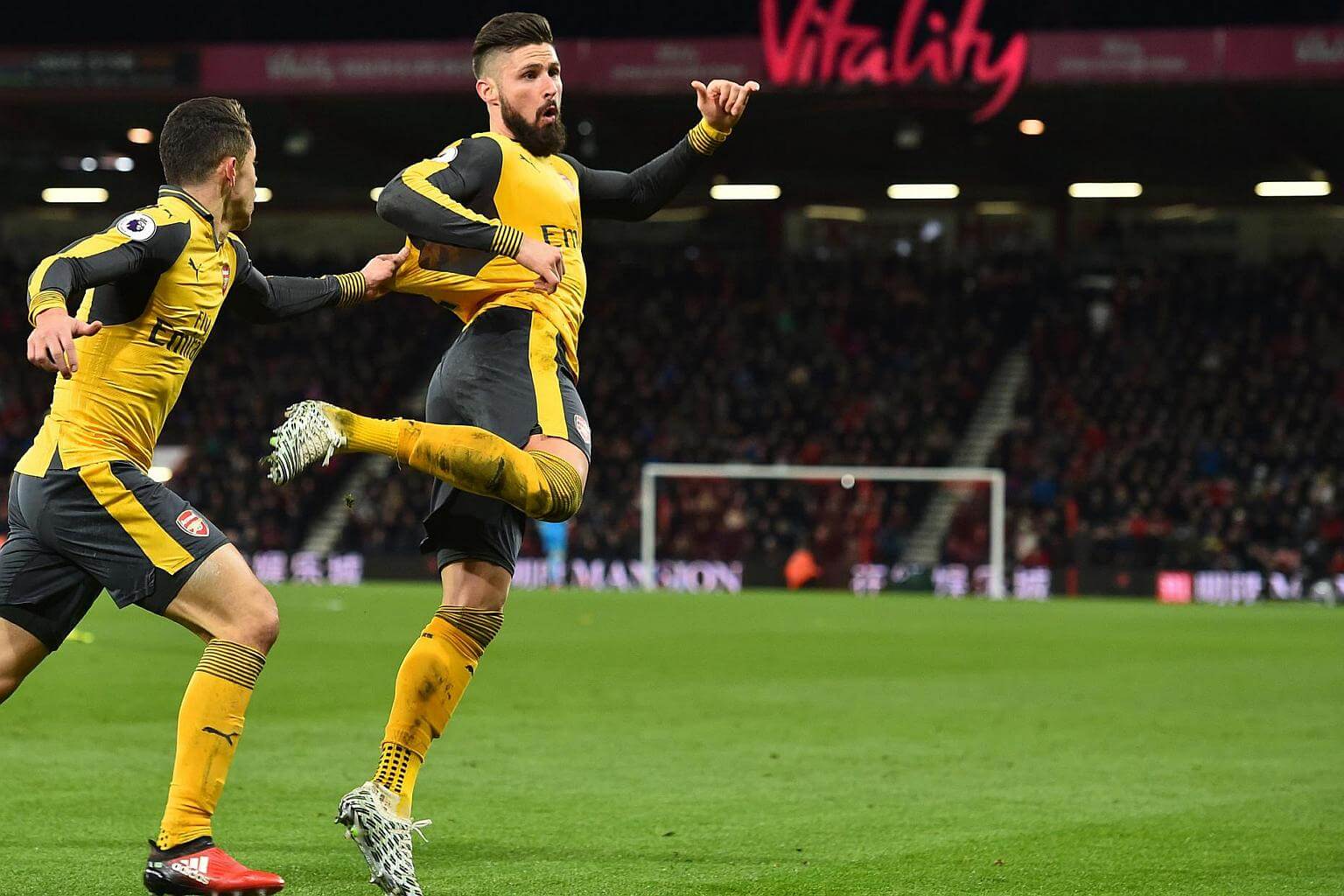 Arsenal's Olivier Giroud celebrates after scoring their third goal during the English Premier League football match between Bournemouth and Arsenal.