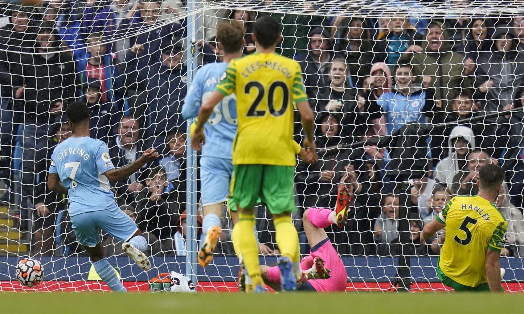 Raheem Sterling scoring Manchester City's fourth goal in the 5-0 home win over Norwich on Aug 21, 2021.