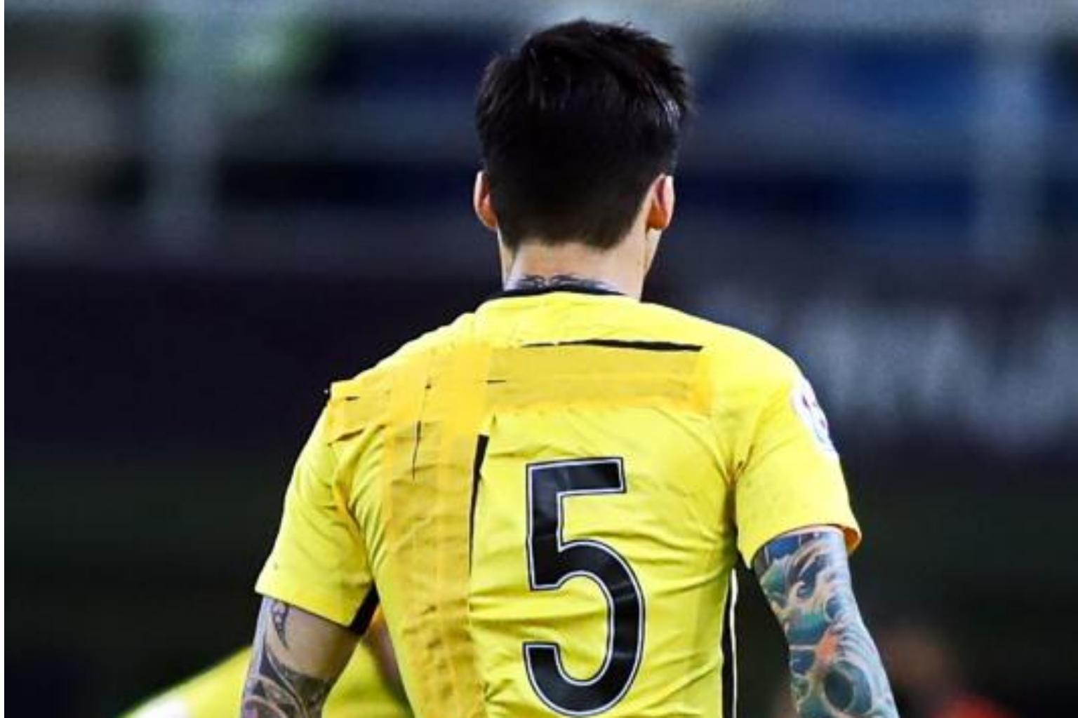 Evergrande staff were unable to immediately rustle up a replacement '5' jersey, so they gave the centre-back substitute Zhang Wenzhao's '15' shirt with yellow tape over the '1'.