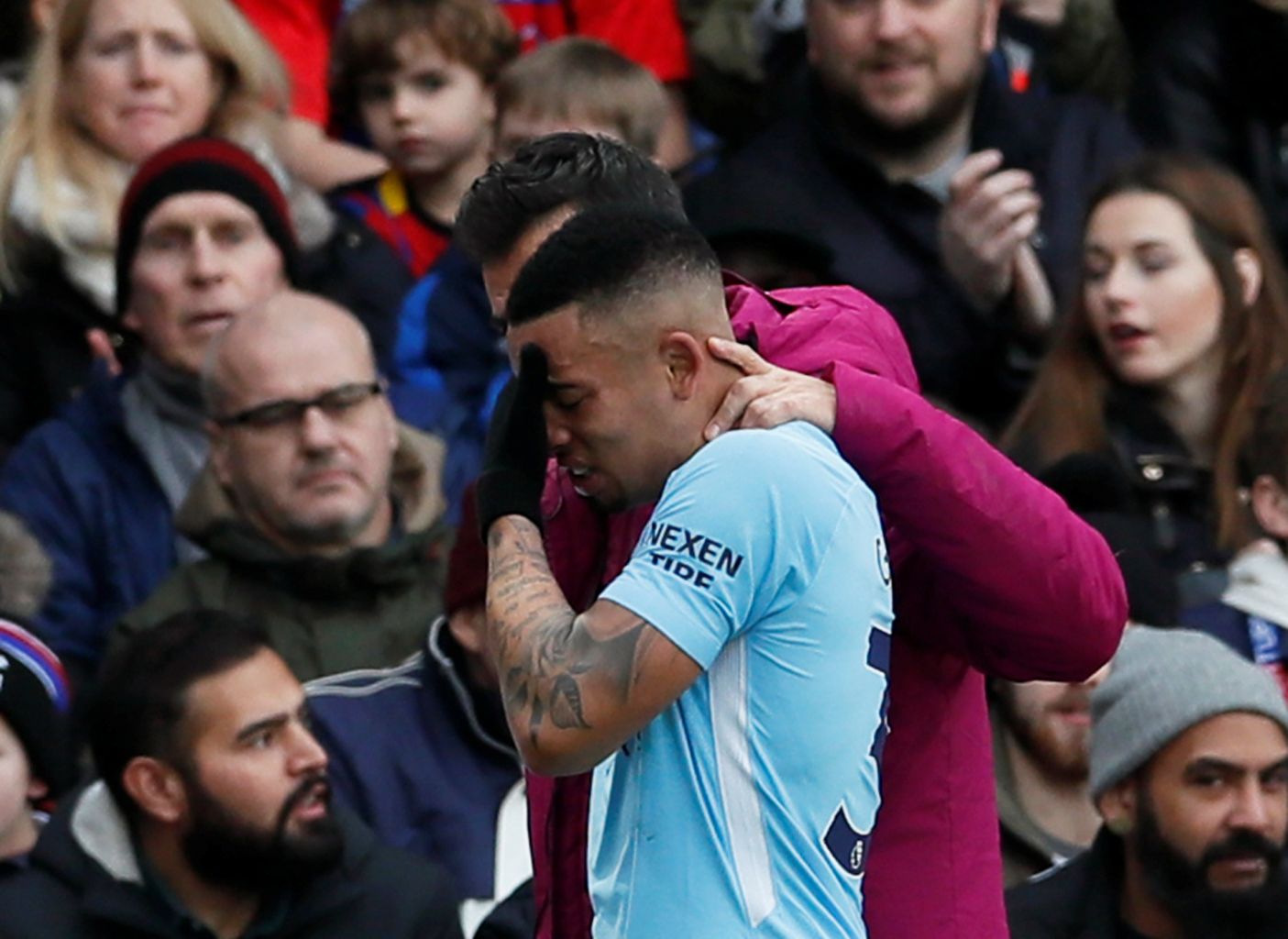 Manchester City's Gabriel Jesus goes off injured against Crystal Palace.