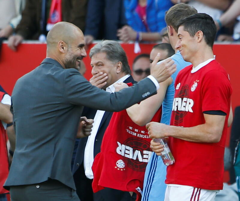 Bayern Munich's coach Pep Guardiola and Robert Lewandowski celebrate after a match.
