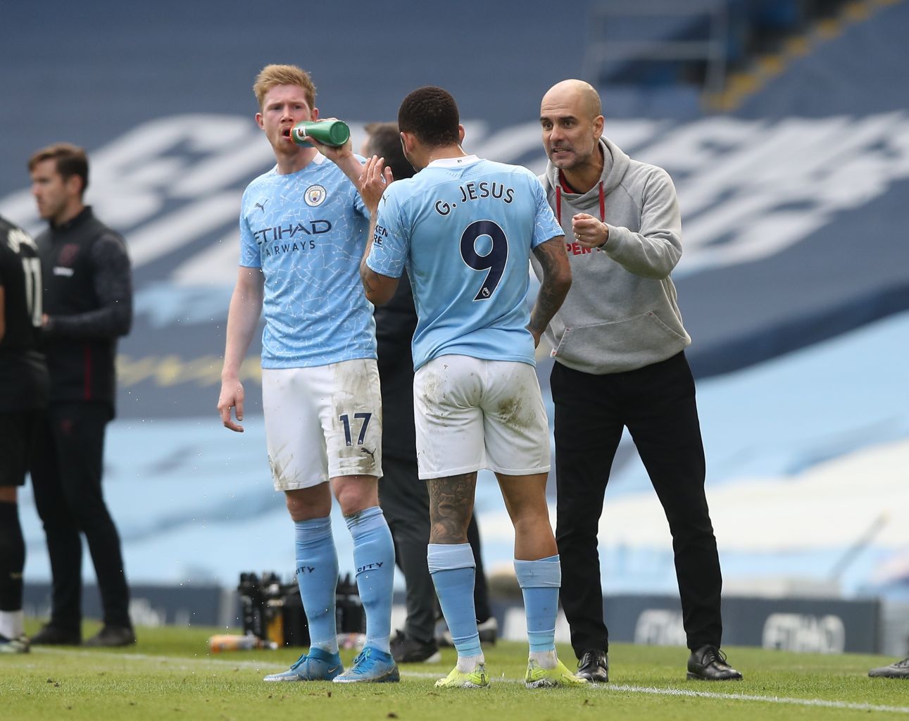 Manchester City manager Pep Guardiola (right) talks to Gabriel Jesus (centre) during their match against West Ham United in Manchester, on Feb 27, 2021.