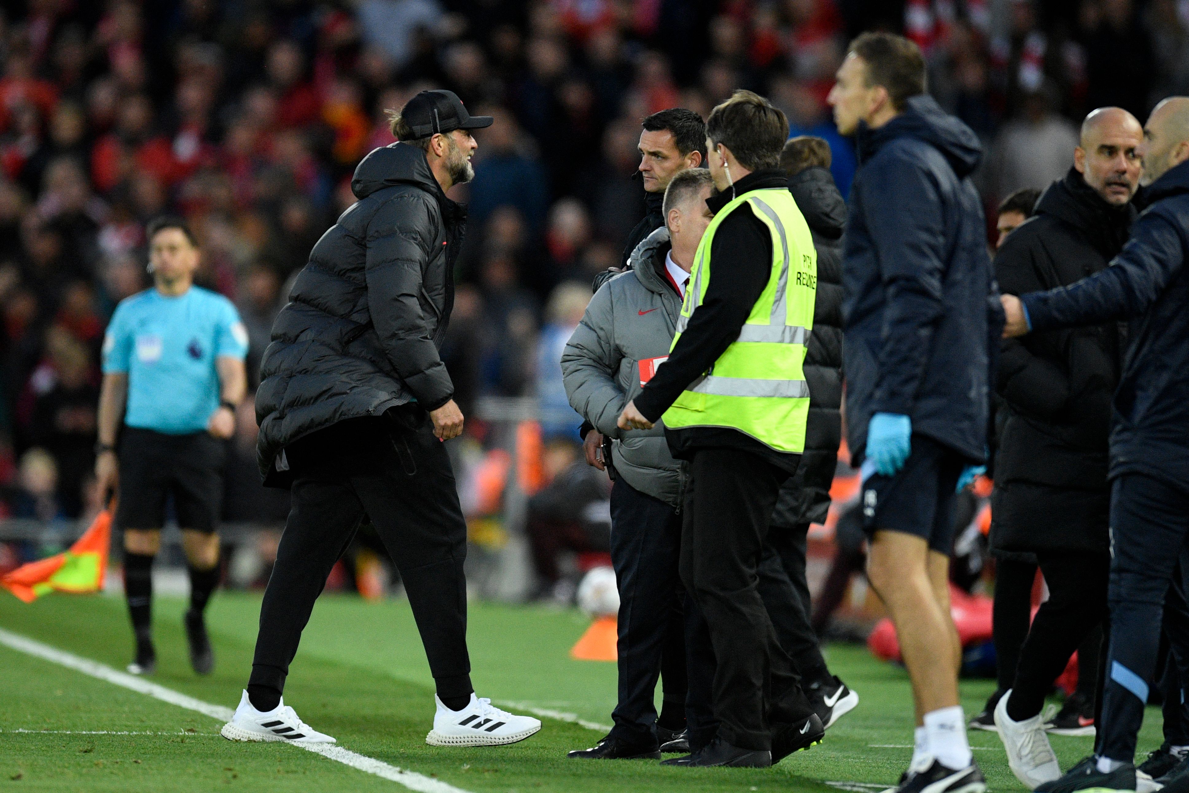 LIVERPOOL, England - Pep Guardiola said coins were thrown at him during Manchester City's 1-0 loss to Liverpool on Sunday, a heated encounter in which home coach Juergen Klopp was sent to the stands.