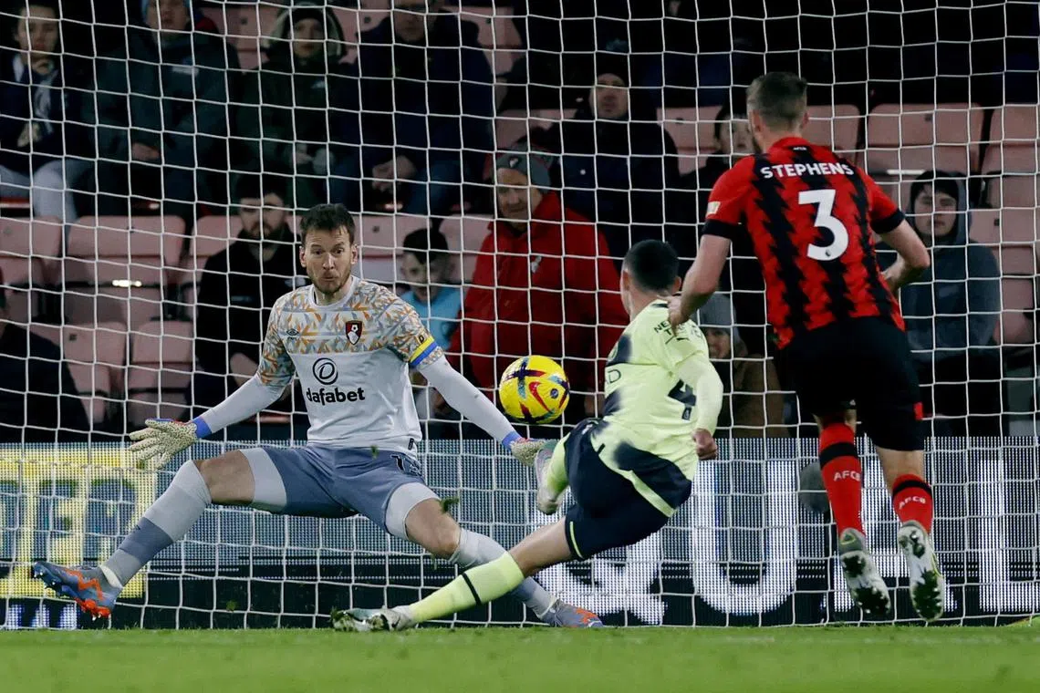 Manchester City’s Phil Foden scores their third goal past Bournemouth’s Neto.