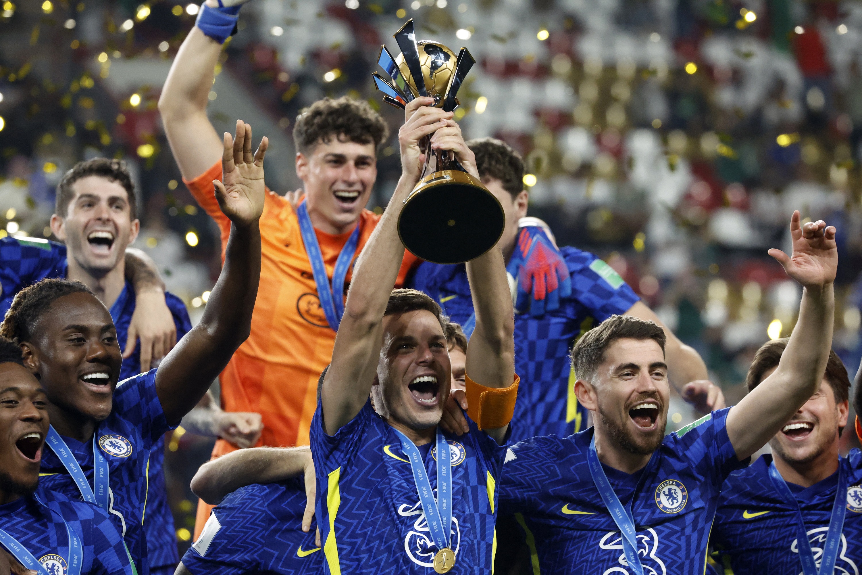 Cesar Azpilicueta lifts the trophy after Chelsea win the Club World Cup.