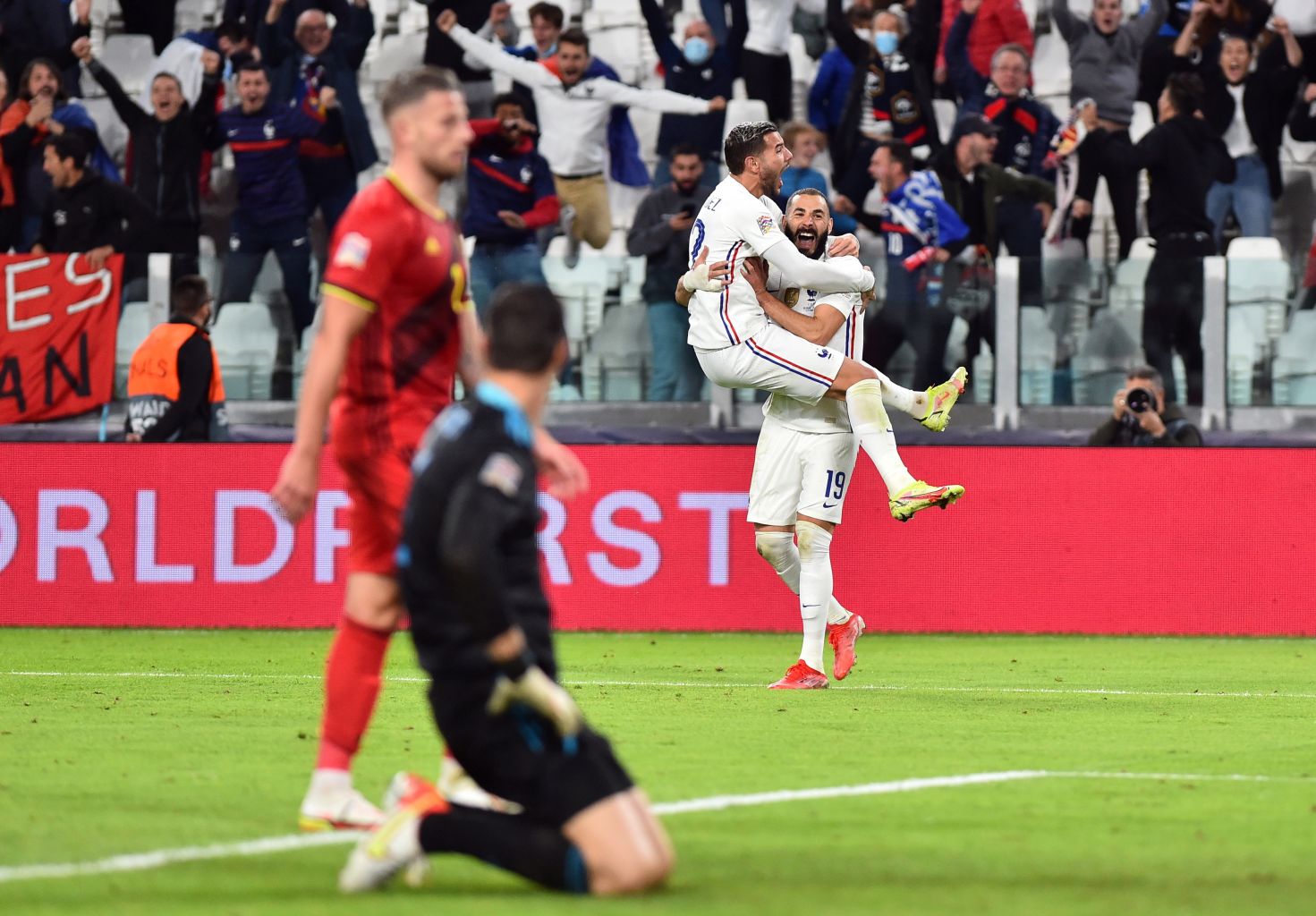 AC Milan full-back Hernandez netted his first France goal in the 90th minute of his second international appearance after France had come back from 2-0 down at half-time at the Allianz Stadium in Turin through strikes from Karim Benzema and Kylian Mbappe.