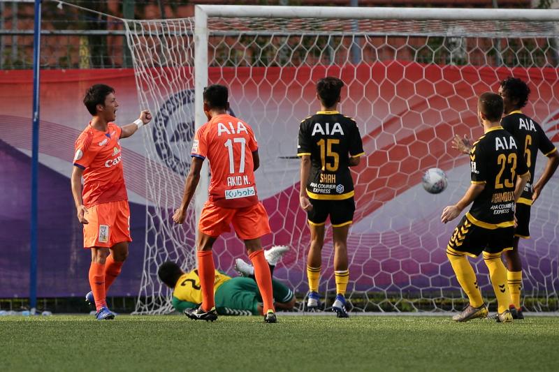 Albirex Niigata’s Hiroyoshi Kamata (left) celebrates after scoring against Tampines Rovers during their Singapore Premier League match at Jurong East Stadium on June 15, 2019.