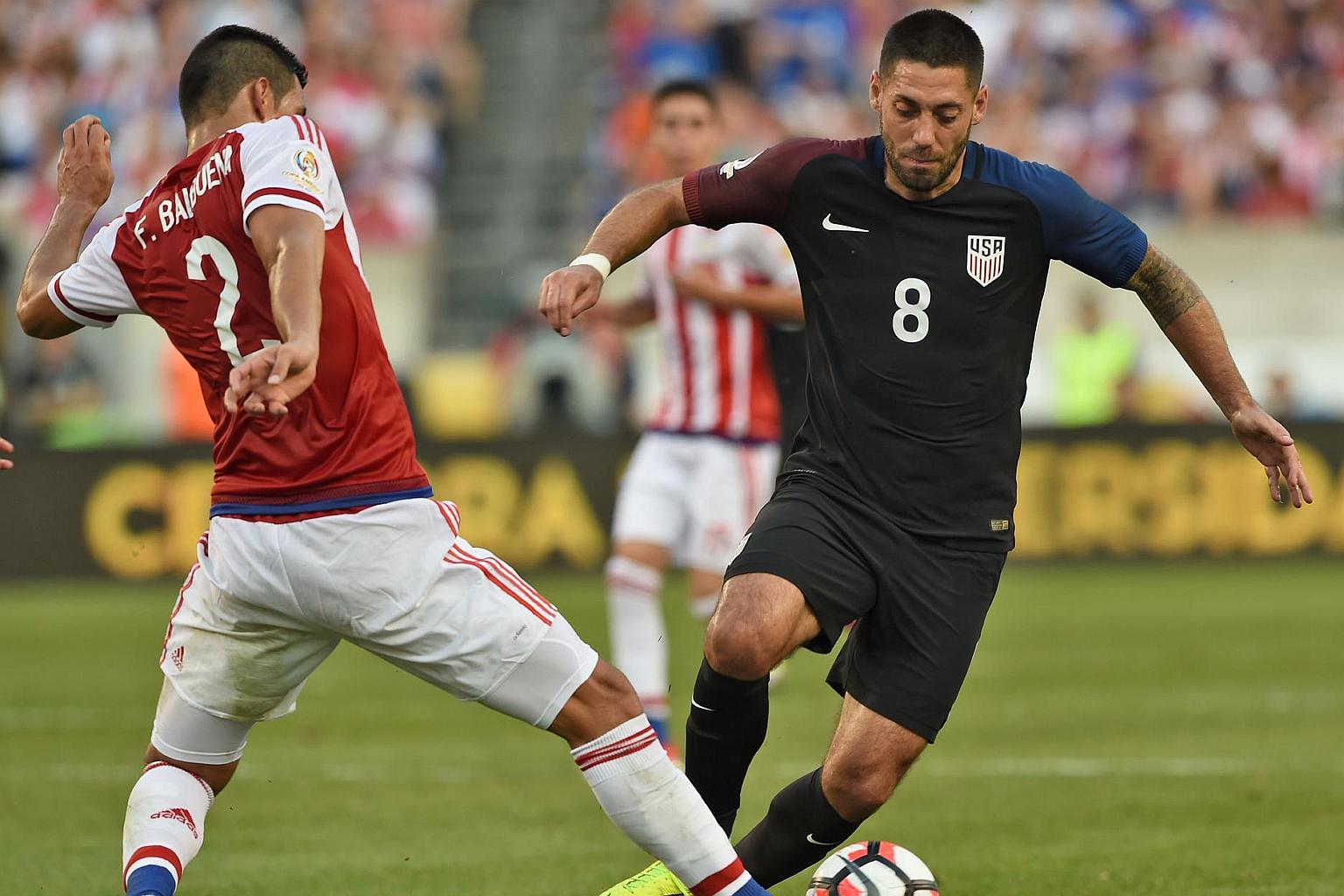 USA's Clint Dempsey (right) is marked by Paraguay's Fabian Balbuena during their Copa America football match.