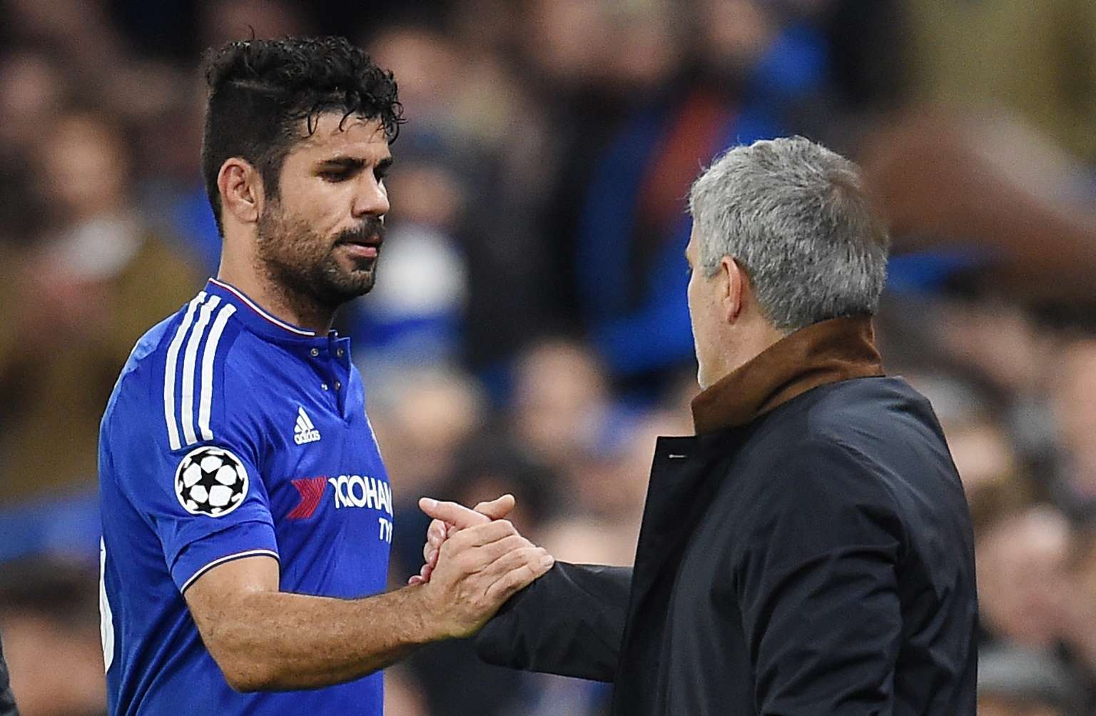 Mourinho shakes hands with Costa as he comes off the pitch on Dec 9, 2015.