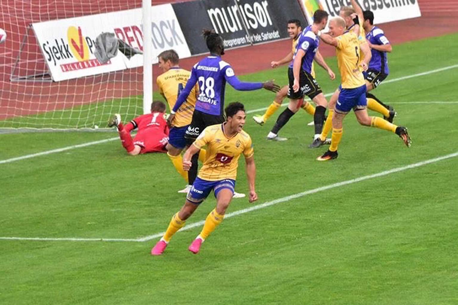 Singapore striker Ikhsan Fandi scoring a goal for Jerv against his his former club Raufoss on Oct 10.
