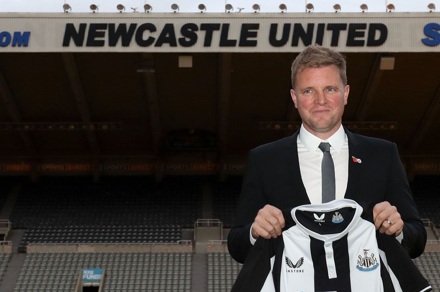 Newcastle United's newly appointed manager, Eddie Howe, poses with a team shirt on the pitch at St James' Park on Nov 10, 2021.