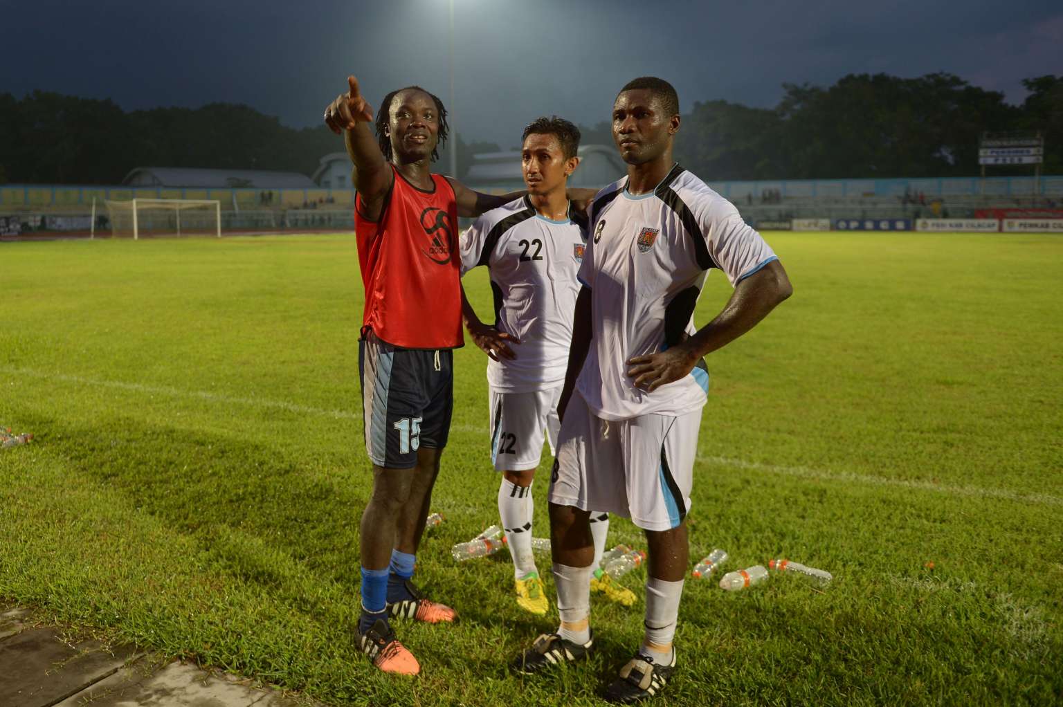 Two foreign players Cameroonian Emile Mbamba (right) and Camaro (left) participating in a football competition in Cilacap, Java on Jan 23, 2016.