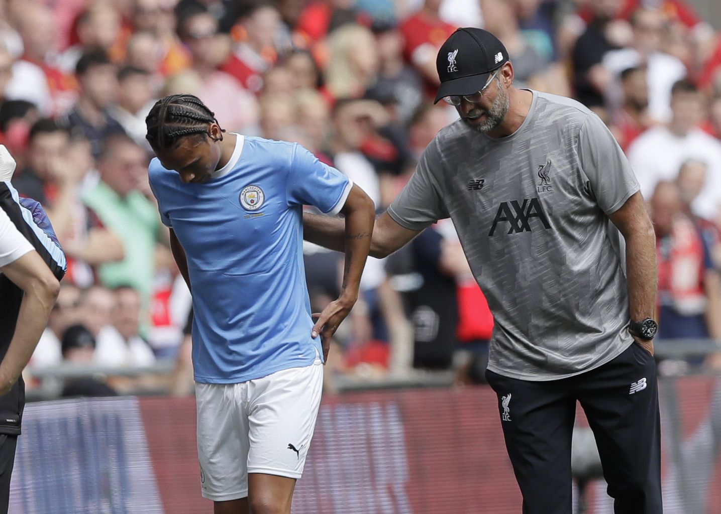 Liverpool manager Jurgen Klopp pats City's Leroy Sane as he leaves the pitch.