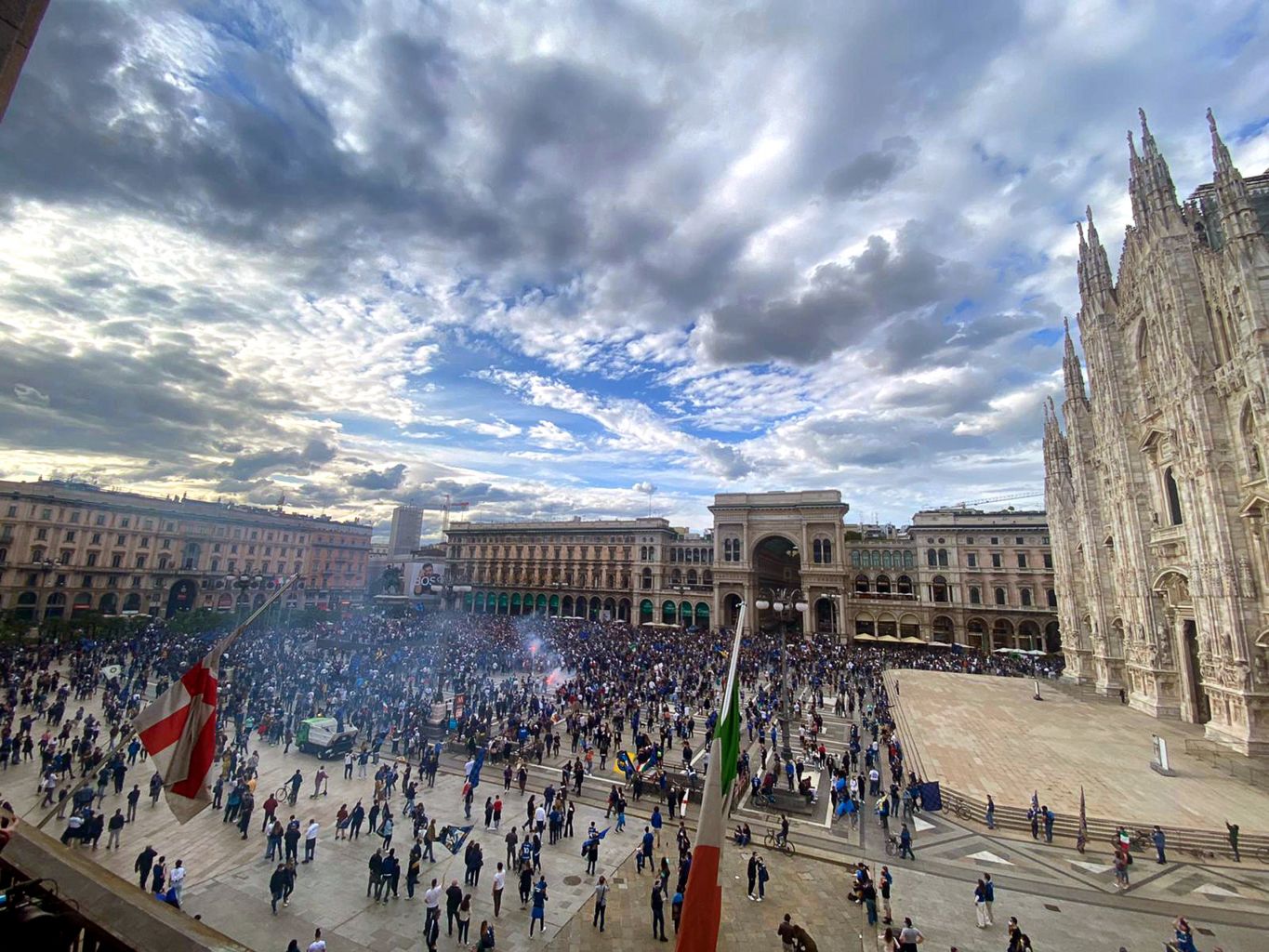 Inter supporters celebrate winning the Scudetto on the Piazza del Duomo in Milan on May 2, 2021.