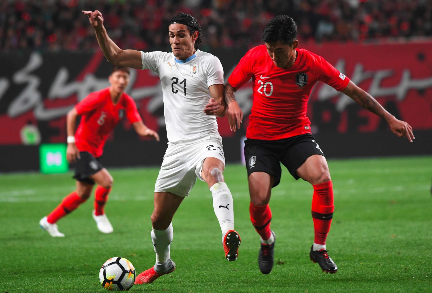 Uruguay's Edinson Cavani (in white) fights for the ball with South Korea's Jang Hyun-soo during a friendly football match in Seoul on Oct 12, 2018.