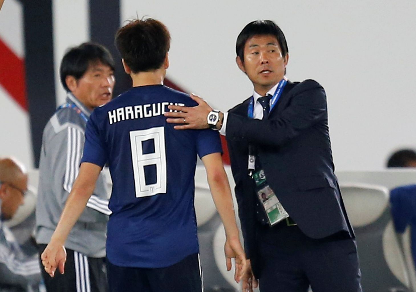 Japan's Genki Haraguchi with coach Hajime Moriyasu as he is substituted.