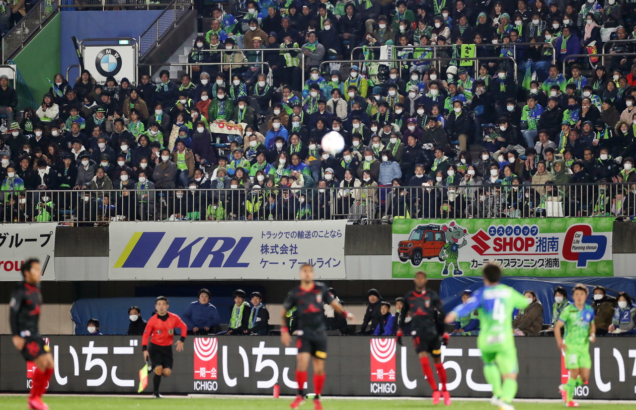 Spectators wearing masks attend a J-League football match in Hiratsuka, Japan, on Feb 21, 2020/
