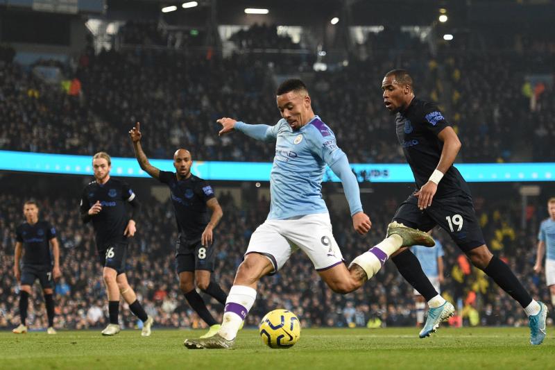 Manchester City striker Gabriel Jesus has a shot on goal during the English Premier League football match against Everton on Jan 1, 2020.