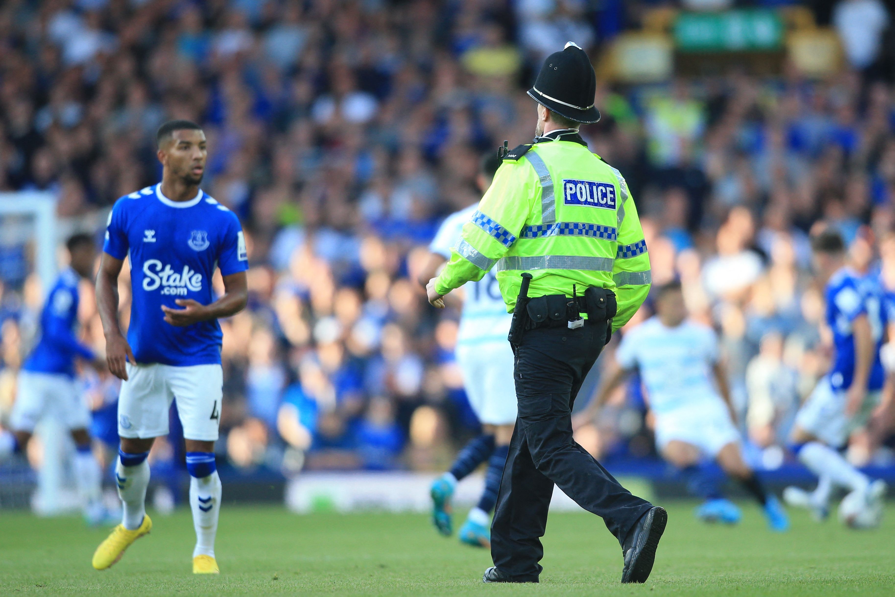 A police officers walks onto the pitch to stop the game because of a medical emergency in the stands.