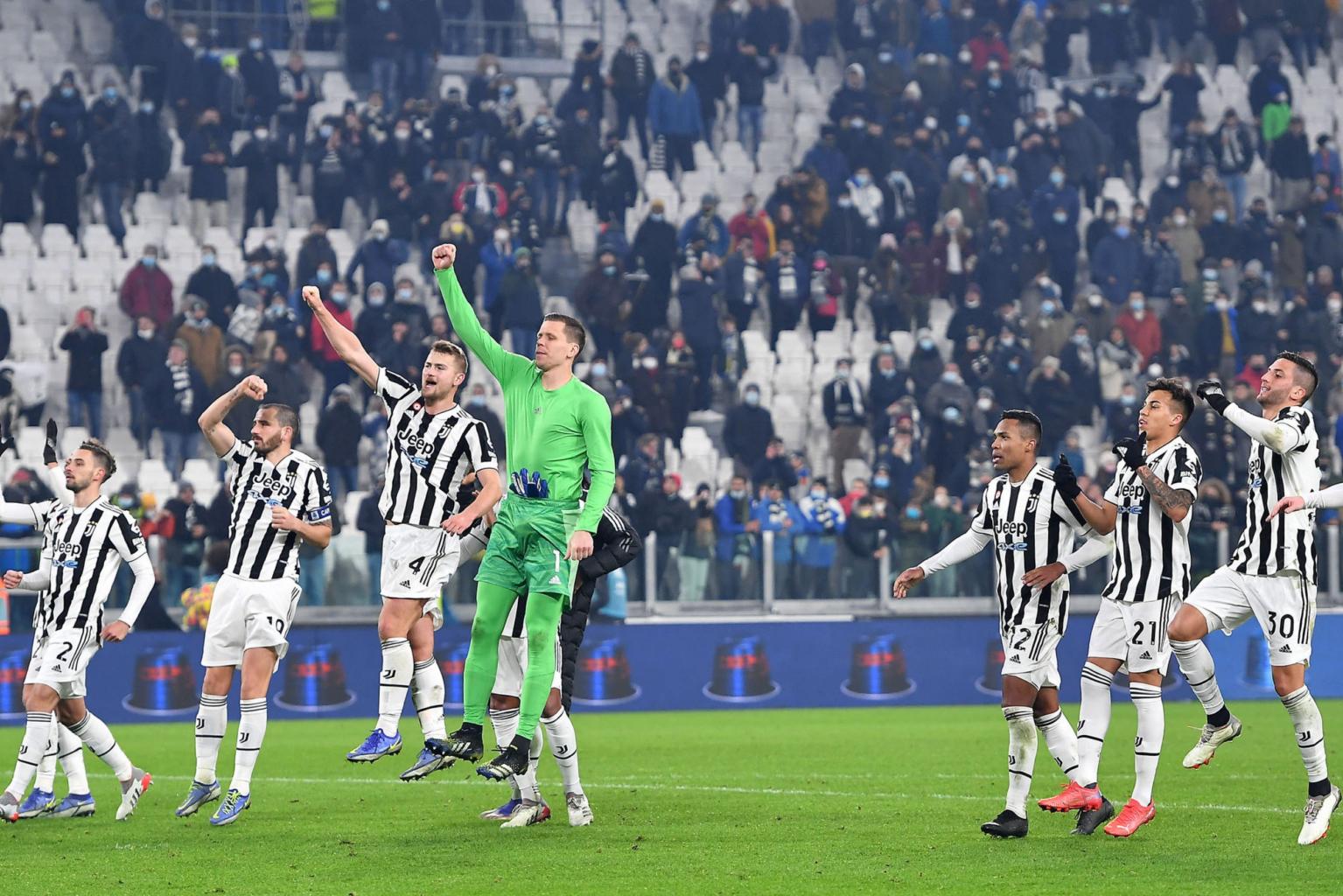Juventus players celebrate winning the Italian Serie A soccer match at the Allianz Stadium in Turin, Italy on Dec 21, 2021.