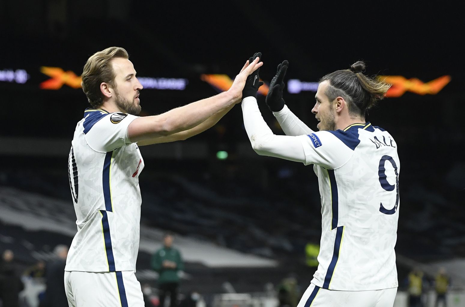 Tottenham's Harry Kane celebrates scoring their second goal with Gareth Bale.