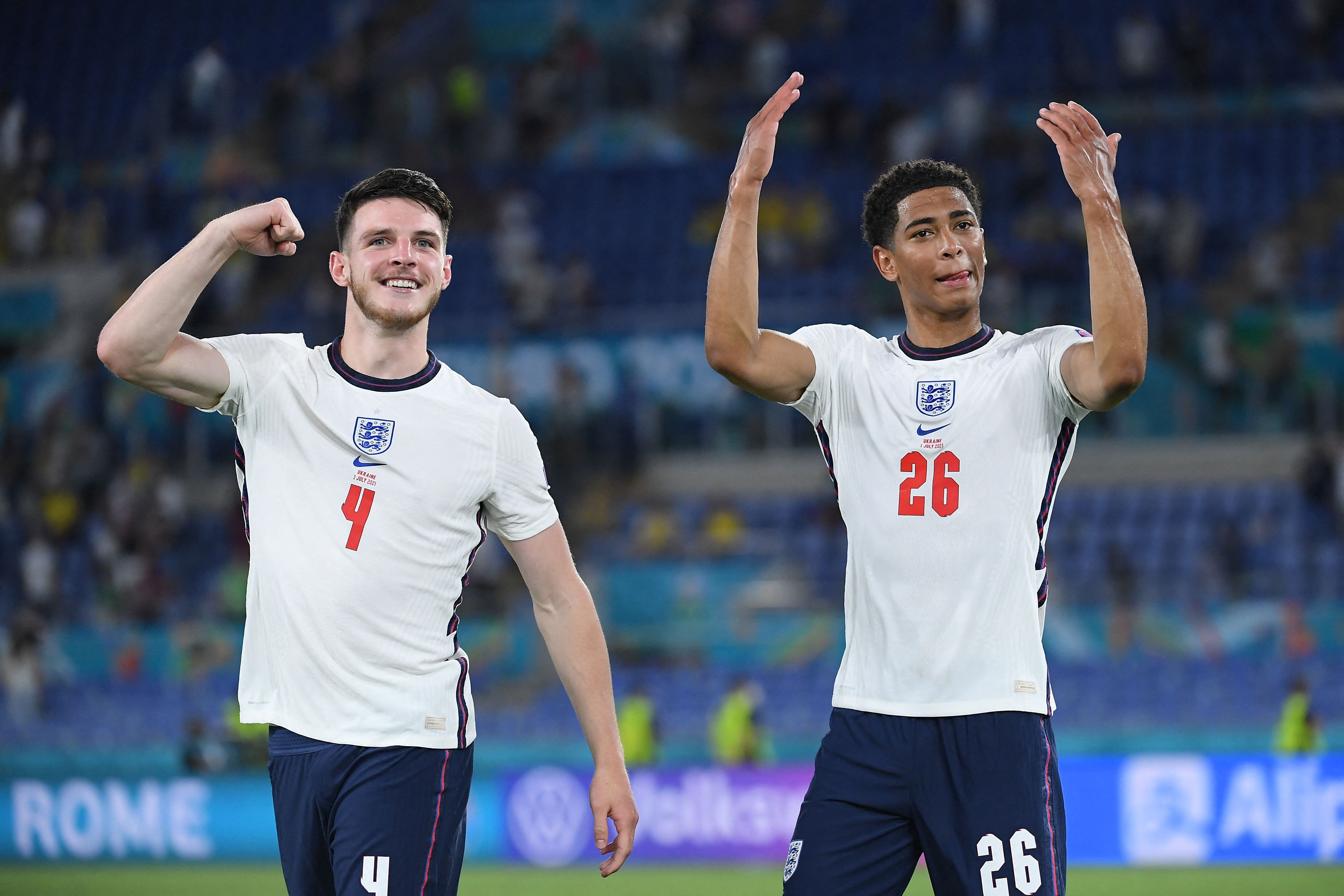 England midfielders Declan Rice (left) and Jude Bellingham celebrate victory.