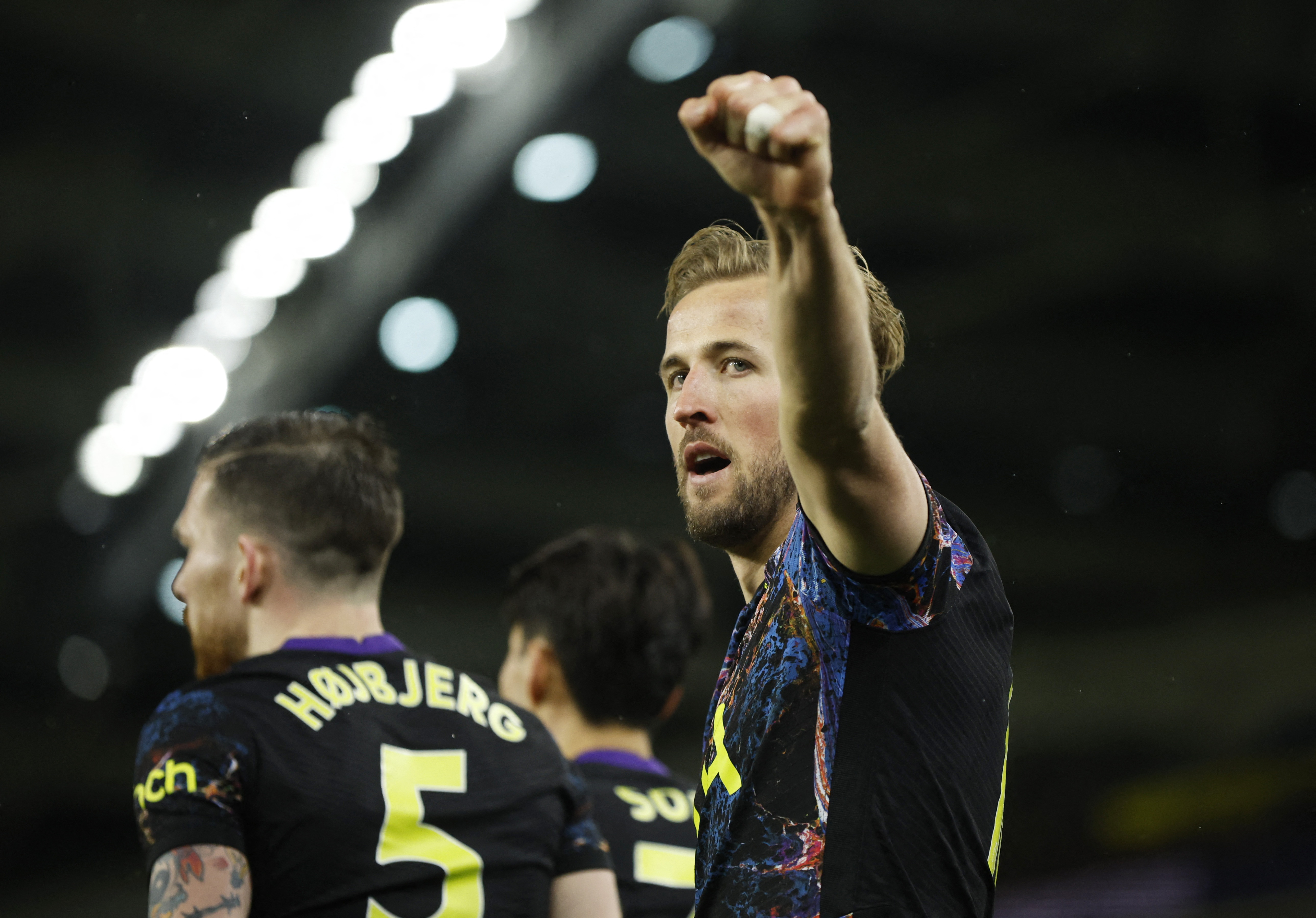 Tottenham Hotspur's Harry Kane celebrates scoring their second goal with Son Heung-min and Pierre-Emile Hojbjerg.