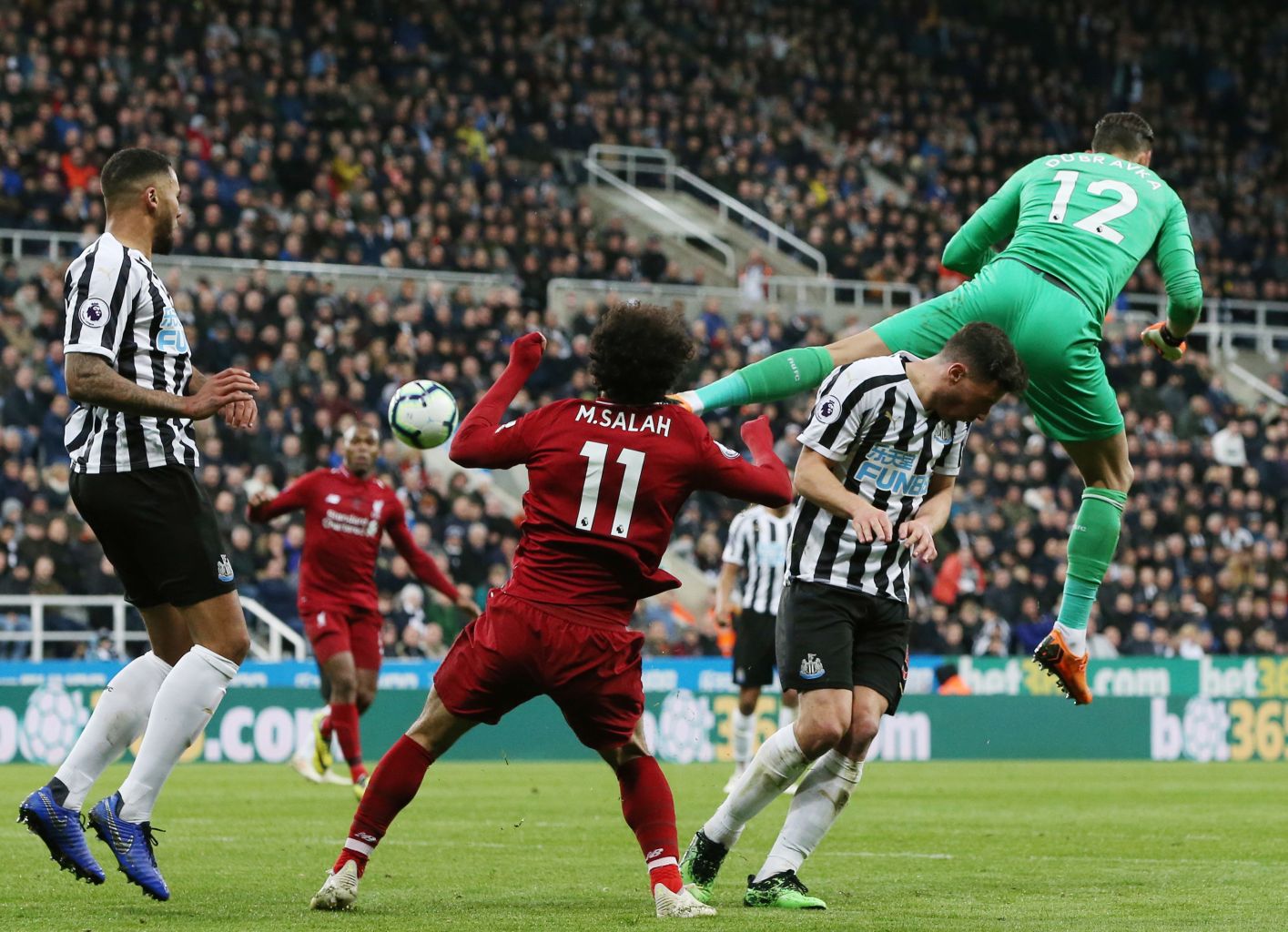 Liverpool's Salah (centre) collides with Newcastle United goalkeeper Martin Dubravka (right).
