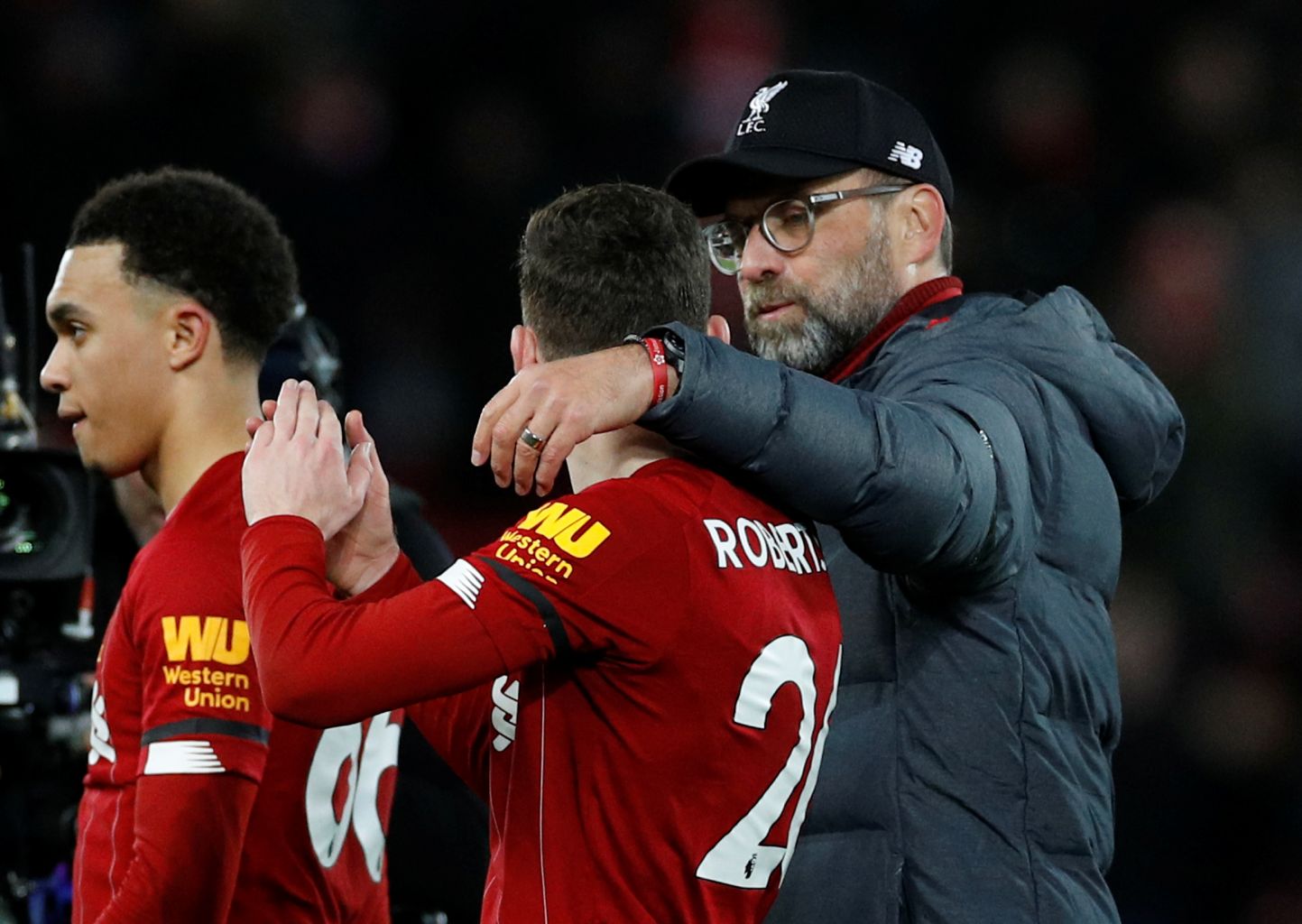 Klopp celebrates after a match with Andrew Robertson and Trent Alexander-Arnold.