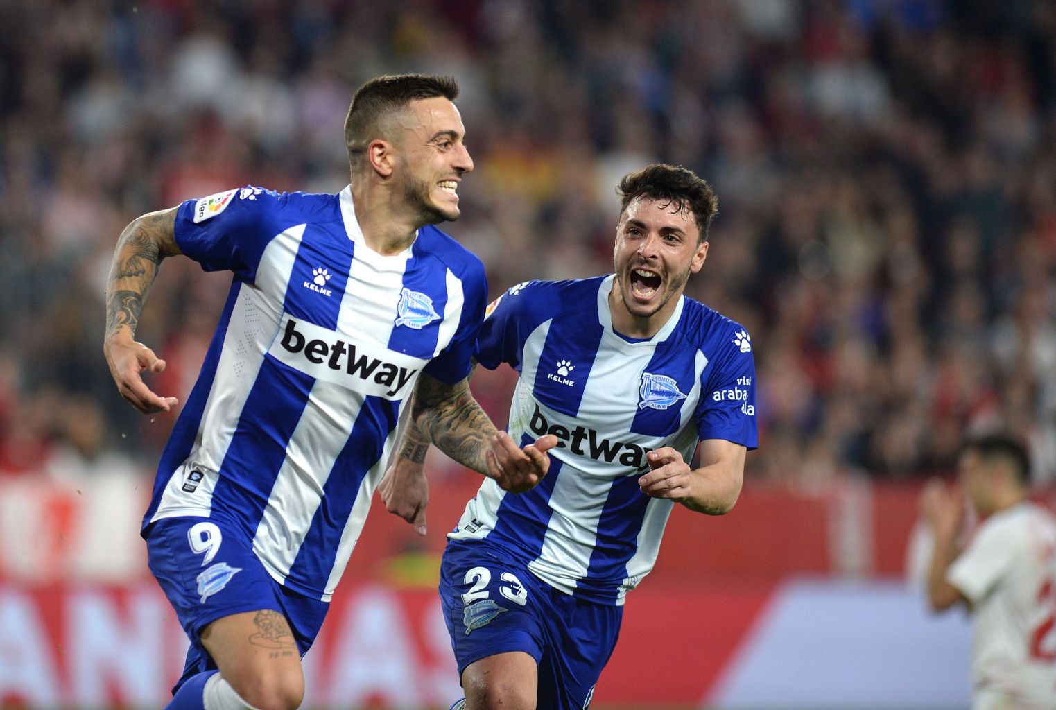 Alaves players Joselu (left) and Ximo Navarro celebrate a goal during a La Liga match against Sevilla FC on Feb 2, 2020.