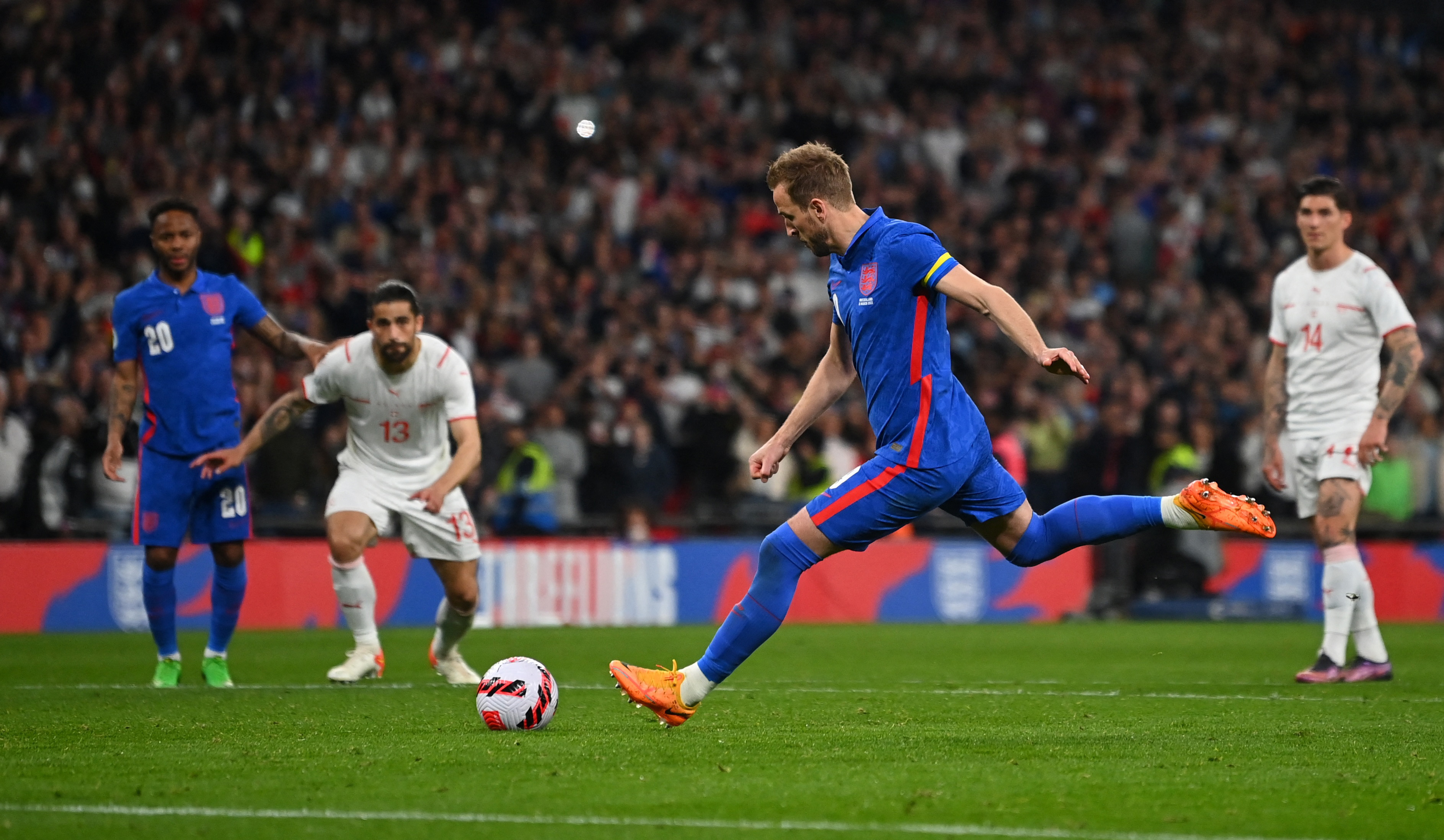 England's Harry Kane scores their second goal from the penalty spot, against Switzerland, on March 26, 2022.