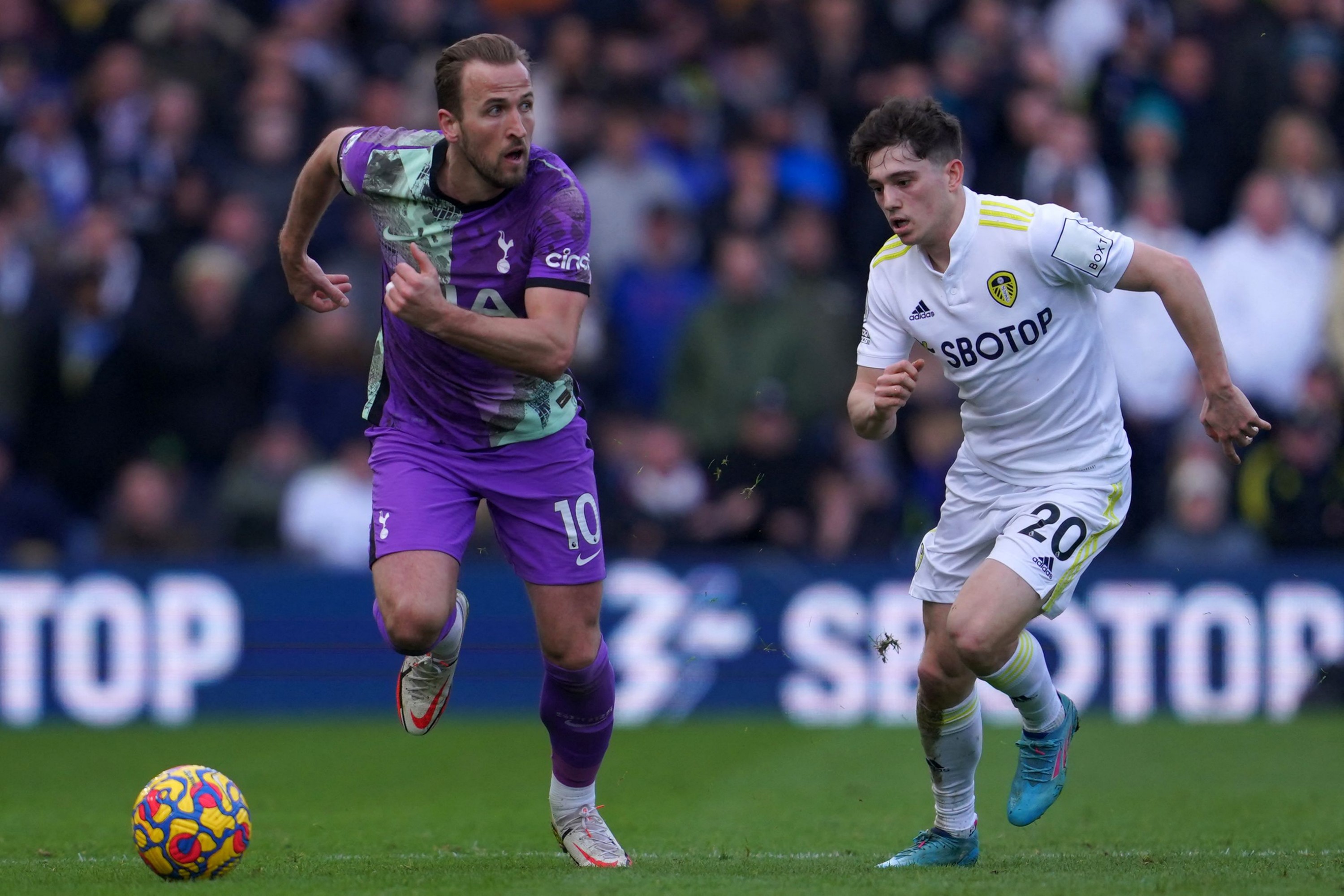 Tottenham Hotspur's English striker Harry Kane (left) with Leeds United's Welsh midfielder Daniel James during the EPL football match on Feb 26, 2022.
