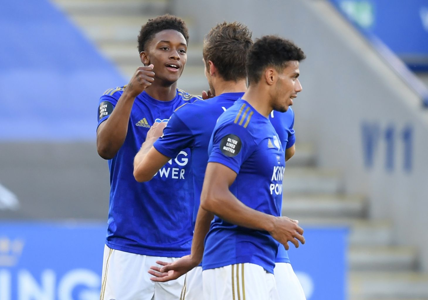 Leicester City's Demarai Gray celebrates scoring their second goal with teammates.