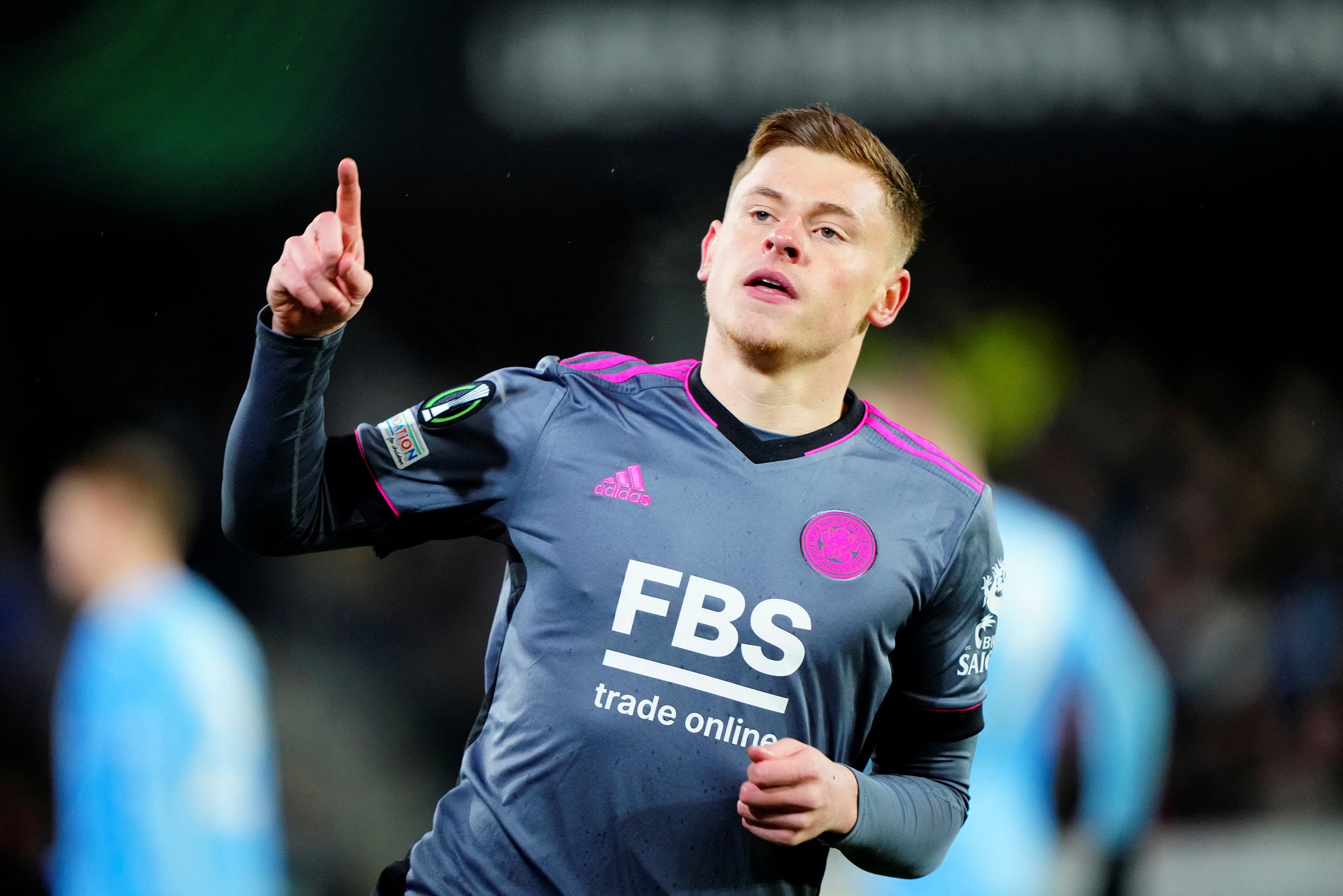 Harvey Barnes celebrates scoring Leicester's first goal.