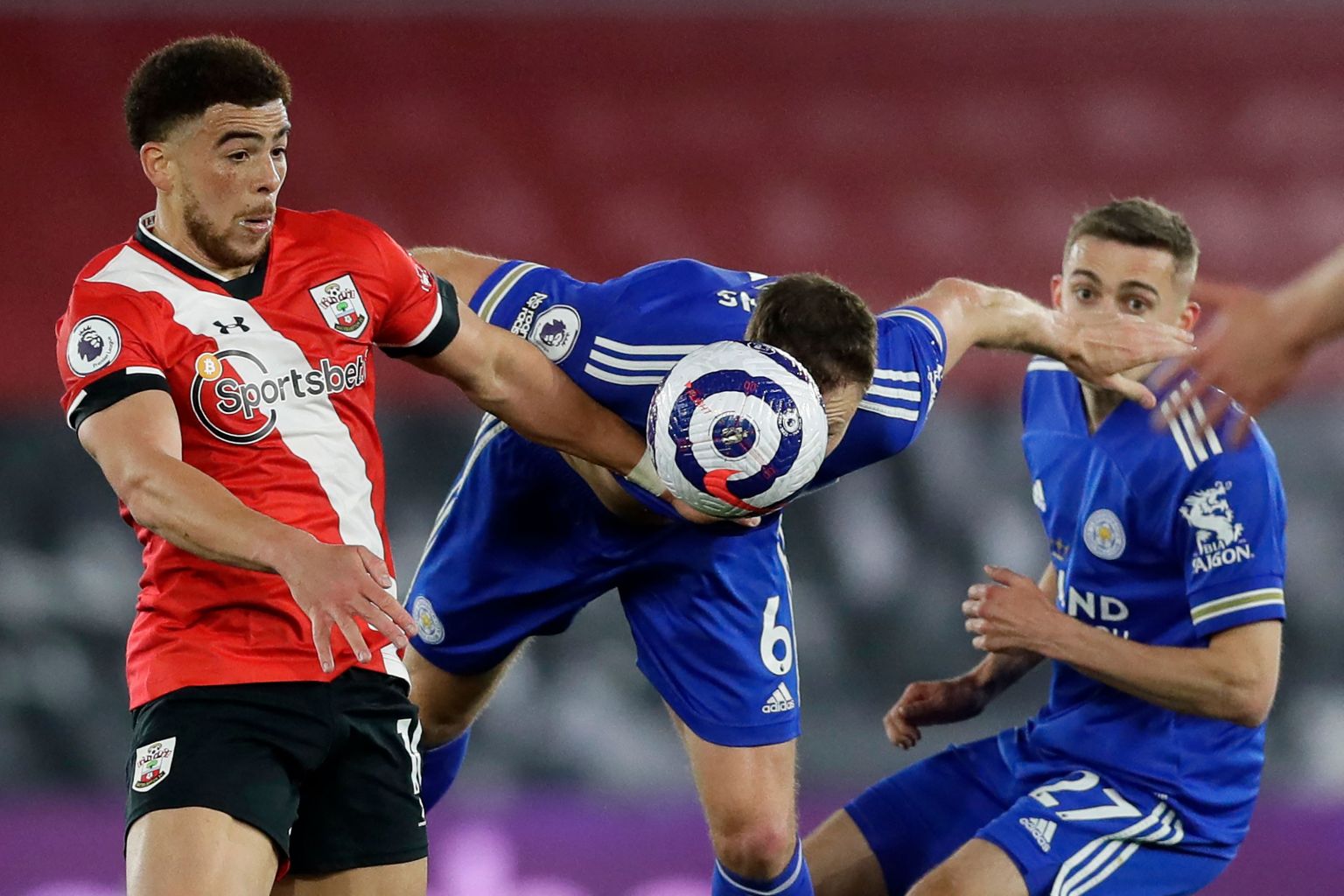 Leicester City's Jonny Evans (centre) vies with Southampton's Che Adams (left) during the match.