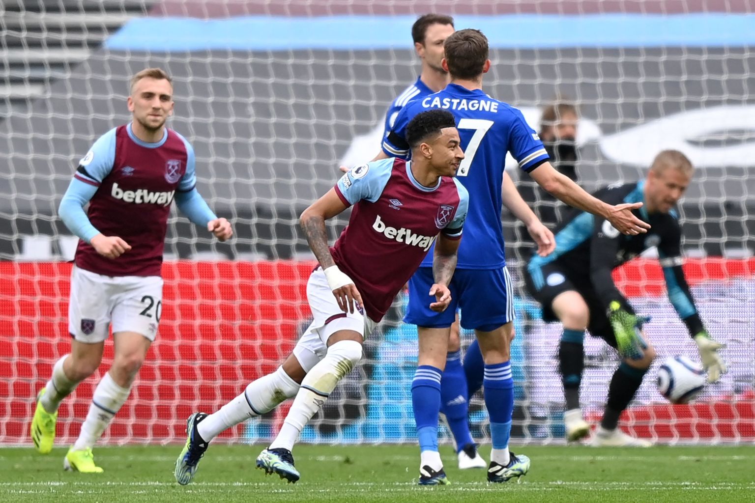 West Ham United's Jesse Lingard (centre) celebrates after scoring the opening goal against Leicester City on April 11, 2021.