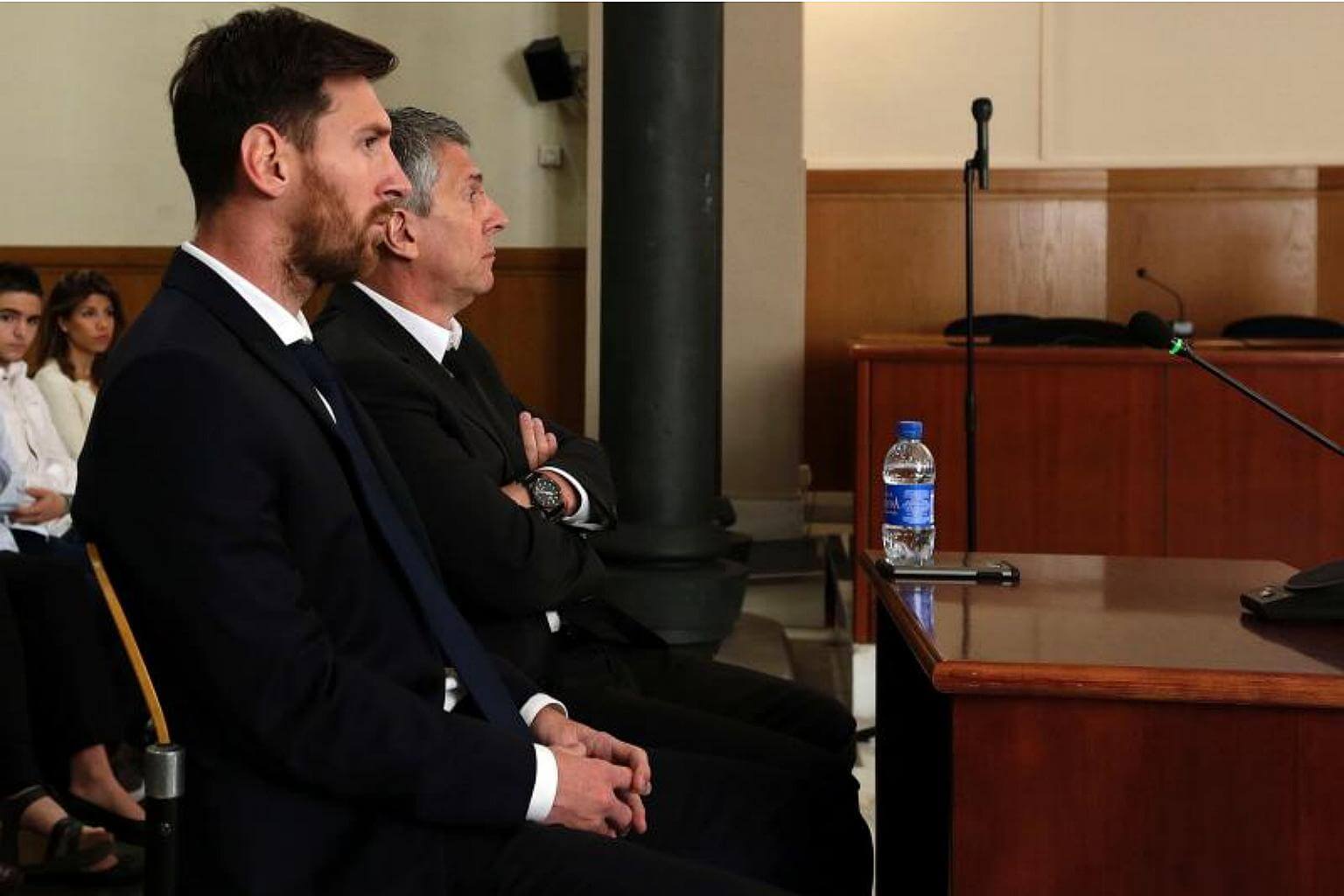 Barcelona's football star Lionel Messi (left) and his father Jorge Horacio Messi listening as they face judges in a tax fraud case at the courthouse in Barcelona, on June 2, 2016.